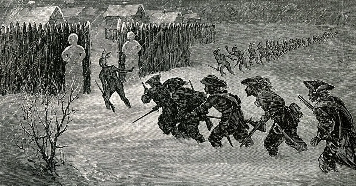 In early 1689, monumental events in Europe would once again affect the destiny of the New World. The newly crowned William III of England joined together with Leopold I, Holy Roman Emperor, to form a ‘Grand Alliance’ against the expansionist ambitions of King Louis XIV of France. In May, William and Leopold officially declared war on France, beginning a conflict that would become known as the Nine Years’ War. Though the kings and generals of Europe hardly paid any thought to the backwoods of North America half a world away, this official declaration of war gave the colonies leave to attack one another with renewed vigor. News of the expanded European conflict had not yet reached the little settlement of Dover, New Hampshire, when, on the night of 27 June 1689, a pair of Wabanaki women arrived and asked for shelter. This was granted and, in the middle of the night, the women threw open the town gates to let in scores of Wabanaki warriors. 20 English settlers were massacred that night, including Major Richard Waldron, the town’s leading citizen. During King Philip’s War, Waldron had used trickery to capture hundreds of Wabanakis before selling them into slavery. Eager to repay this debt, the Wabanaki warriors now burst into his bedroom, clubbed him over the head, and dragged him into the next room where they tied him to a chair and tortured him to death. The Wabanakis then absconded from the ruined settlement with 29 English prisoners, who were sold into captivity in New France.