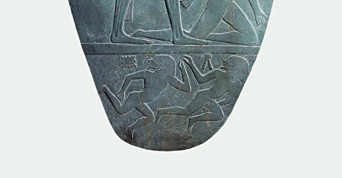 The other side of the palette (considered the back side) is a single, cohesive image of Narmer with his war club about to strike down an enemy he holds by the hair. Beneath his feet are two other men either dead or attempting to escape his wrath. A bald servant stands behind the king holding his sandals while, in front of him and above his victim, the god Horus is depicted watching over his victory and blessing it by bringing him more enemy prisoners.