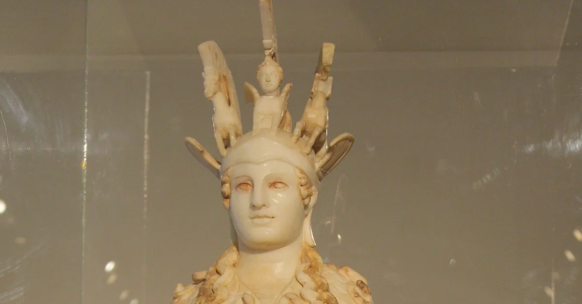 According to modern research, the Athena Parthenos, begun in 447 BCE and dedicated in 438 BCE, was forty feet tall and draped in ivory with over a ton of gold. She was dressed in a tunic, carried an aegis (a type of shield) adorned with the head of Medusa, and helmet. In her right hand she held an image of Nike, the goddess of victory, and in her left she clutched a spear. The Parthenos stood behind a shallow pond filled with oil not only to provide a reflection of the statue but also to aid in keeping the statue's ivory from cracking in the dry Athenian heat.