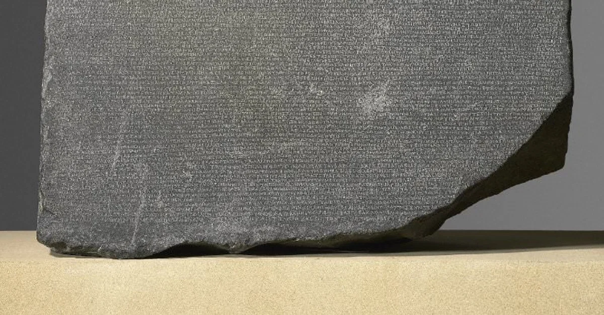 The Rosetta Stone is an incomplete grey and pink granodiorite stela dating from 196 BCE which presents a priestly decree concerning King Ptolemy V of Egypt. The text is in three different versions: Hieroglyphic, Demotic and Greek, a fact which immeasurably helped to finally decipher Egyptian hieroglyphics. The Rosetta Stone is today on display in the British Museum, London.
