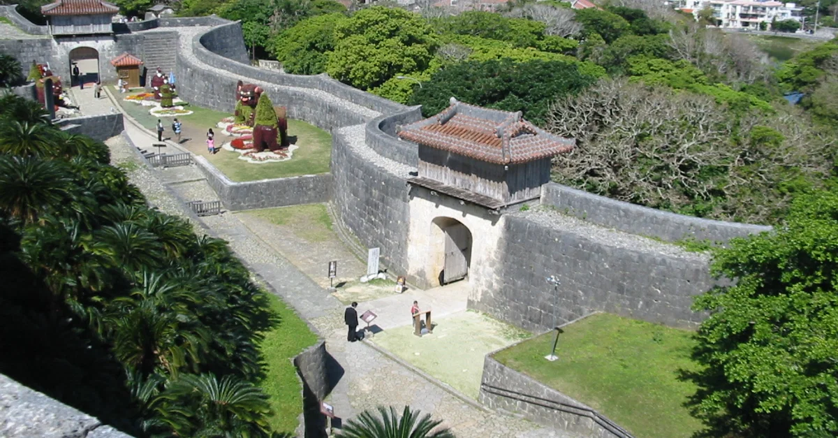 Shuri castle is located just southeast of the city of Naha at the very southern end of Okinawa Island. The castle was built c. 1350 and became the royal, political and ceremonial centre of the Ryukyu islands. Built on a natural hill, the castle stands 120 metres (394 ft) above sea level and its buildings display a mix of Chinese and Japanese architectural elements combined with local materials such as limestone and coral.