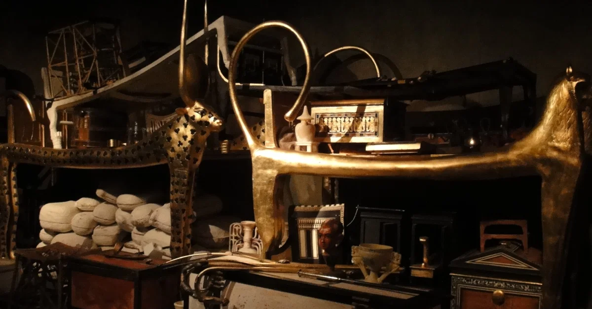 The room into which Carter peered was packed with all the possessions Tutankhamun would need in the next world – chariots, statues, game boards, linens, jewelry, beds, chairs, even a throne; they were all piled on top of each other. The ancient robbers had apparently been caught in the act or frightened away, for little had been disturbed. The tomb was virtually intact.