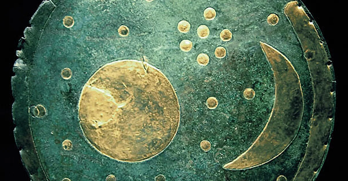 The Nebra Sky Disk is one of the most fascinating, and some would say controversial, archaeological finds of recent years. Dated to 1600 BCE, this bronze disk has a diameter of 32cm (about the size of a vinyl LP) and weighs around 2 kg. It is patinated blue-green and embossed with gold leaf symbols which appear to represent a crescent moon, the sun (or perhaps a full moon), stars, a curved gold band, interpreted as a sun boat, and a further gold band on the edge of the disk which probably represent one of the horizons (another gold band on the opposite side is missing).