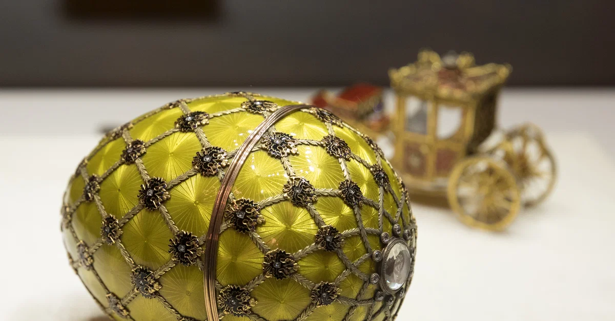 The 1897 Imperial Coronation Coach Egg by Peter Carl Fabergé (1846-1920). The egg was given by Tsar Nicholas II (r. 1894-1917) to his wife Alexandra Feodorovna. The egg is made of gold and yellow and black enamel. The trellis work has double-headed eagles at all of the junctions. Inside the egg is an exact miniature model of the Russian coronation coach which is made from gold and red enamel. It measures 12.7 cm (5 in) in length.