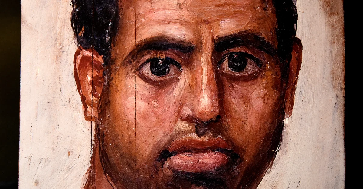 This woman wears a brown robe, gold earrings, and a simple necklace. "Isarous" is written in Greek across the background. An analysis of the plate revealed the presence of beeswax as the binding medium.