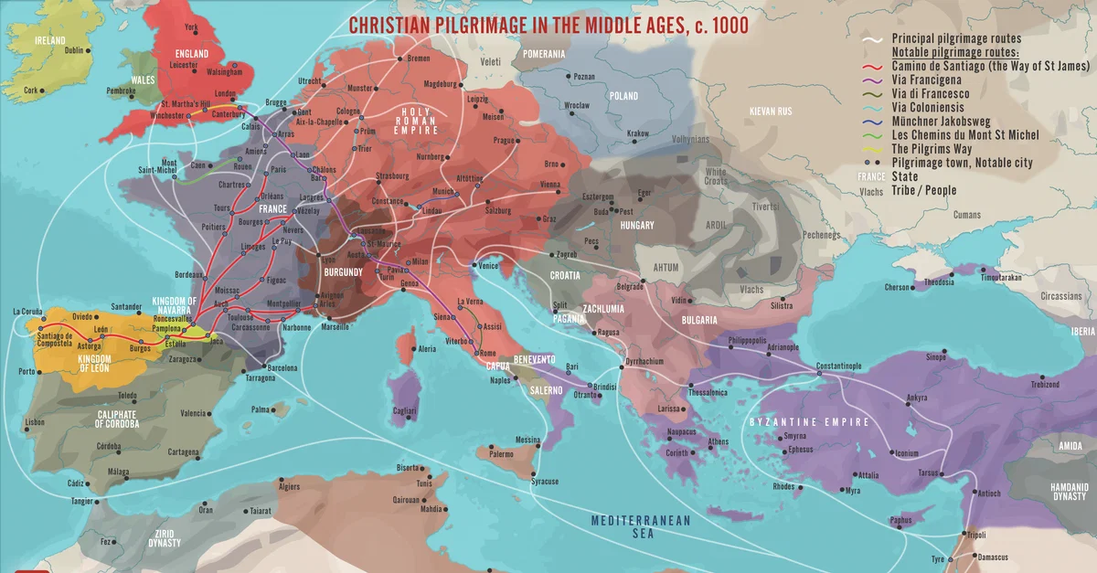 This map illustrates the spread of the 14th-century plague pandemic, the “Black Death,” which swept across Europe and the Middle East between 1346 and 1353. Originating in Central Asia, it traveled on merchant vessels carrying grain and furs from the Italian Black Sea colonies of Kaffa and Tana, moving rapidly along dense and interwoven sea and land trade routes to reach nearly every corner of the continent in just a few years.