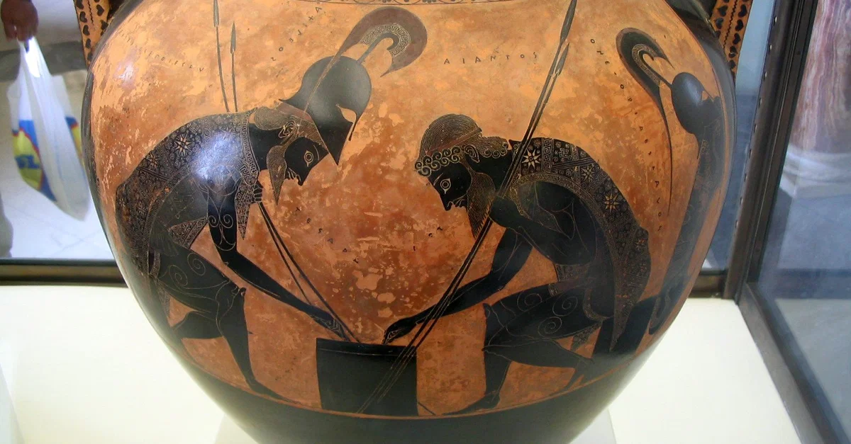 A detail of the celebrated Athenian black-figure belly amphora (Type A) by Exekias, c. 530 BCE. The central scene depicts Achilles and Ajax playing a board game during a respite in the Trojan War. (Museo Gregoriano Etrusco, The Vatican, Rome)