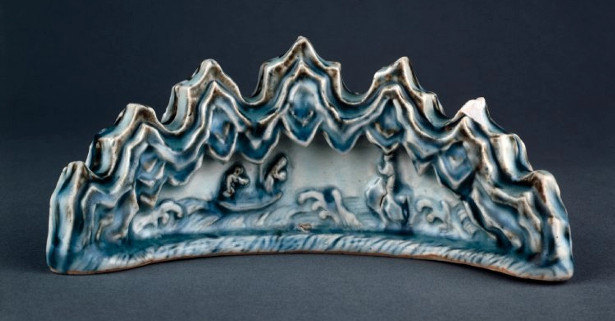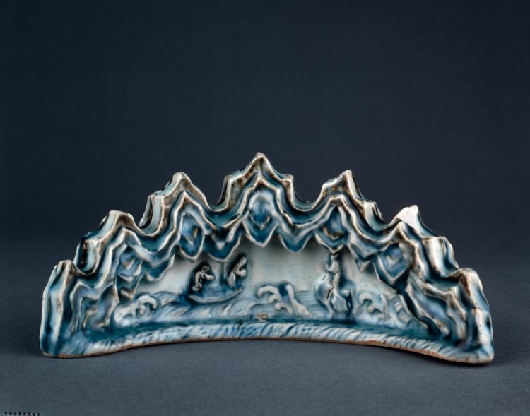 A Ming Dynasty (1368-1644 CE) porcelain brush stand in the form of a mountain range. From the noted porcelain centre of Jingdezhen, 16th century CE. Height: 8 cm. Length: 17.2 cm. (British Museum, London)