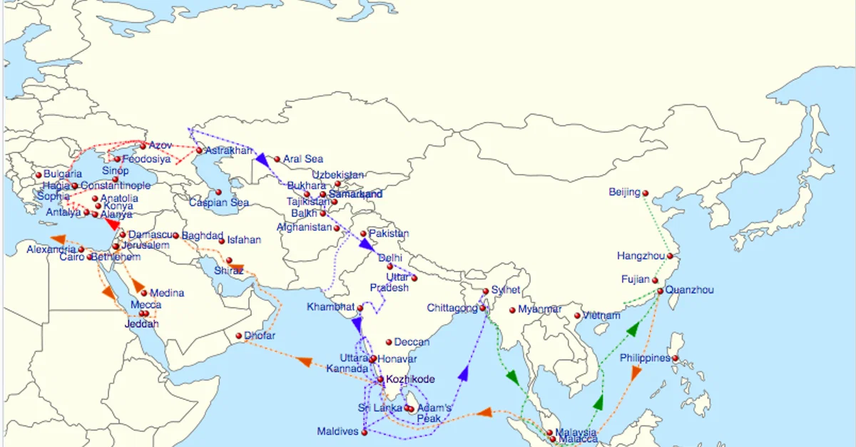 Sladew. (2019, February 07). Map of Ibn Battuta's Travels, 1332-47 CE. World History Encyclopedia. https://www.worldhistory.org/image/10032/map-of-ibn-battutas-travels-1332-47-ce/