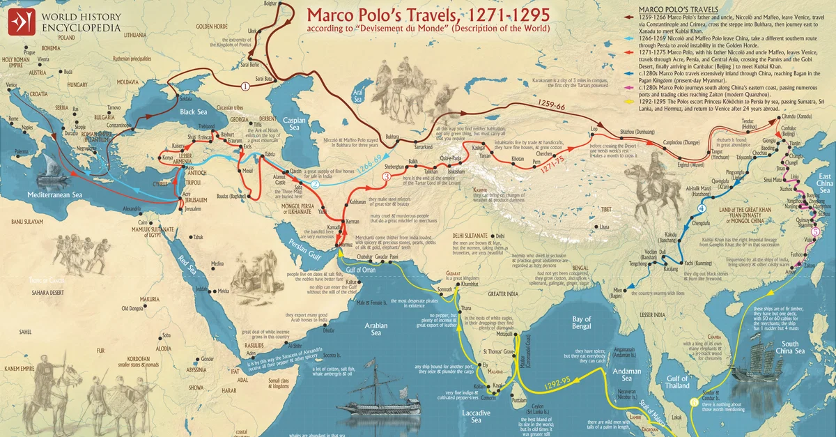 Netchev, S. (2019, February 11). Map of Marco Polo’s Travels, 1271 - 1295. World History Encyclopedia. https://www.worldhistory.org/image/10041/map-of-marco-polos-travels-1271---1295/