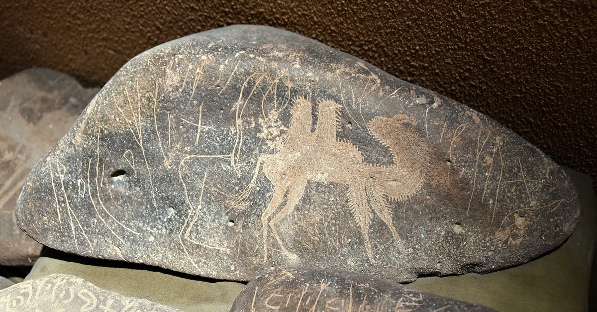 Safaitic inscription with an image of a Bactrian camel carved on a desert rock. The detailed drawing indicates that the scribe has seen this type of Asian camel, probably along the trade route with China. First century BCE to fourth century CE. From the al-Mafraq region, Jordan. On display at the Jordan Museum, Amman, Jordan.