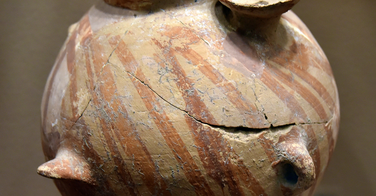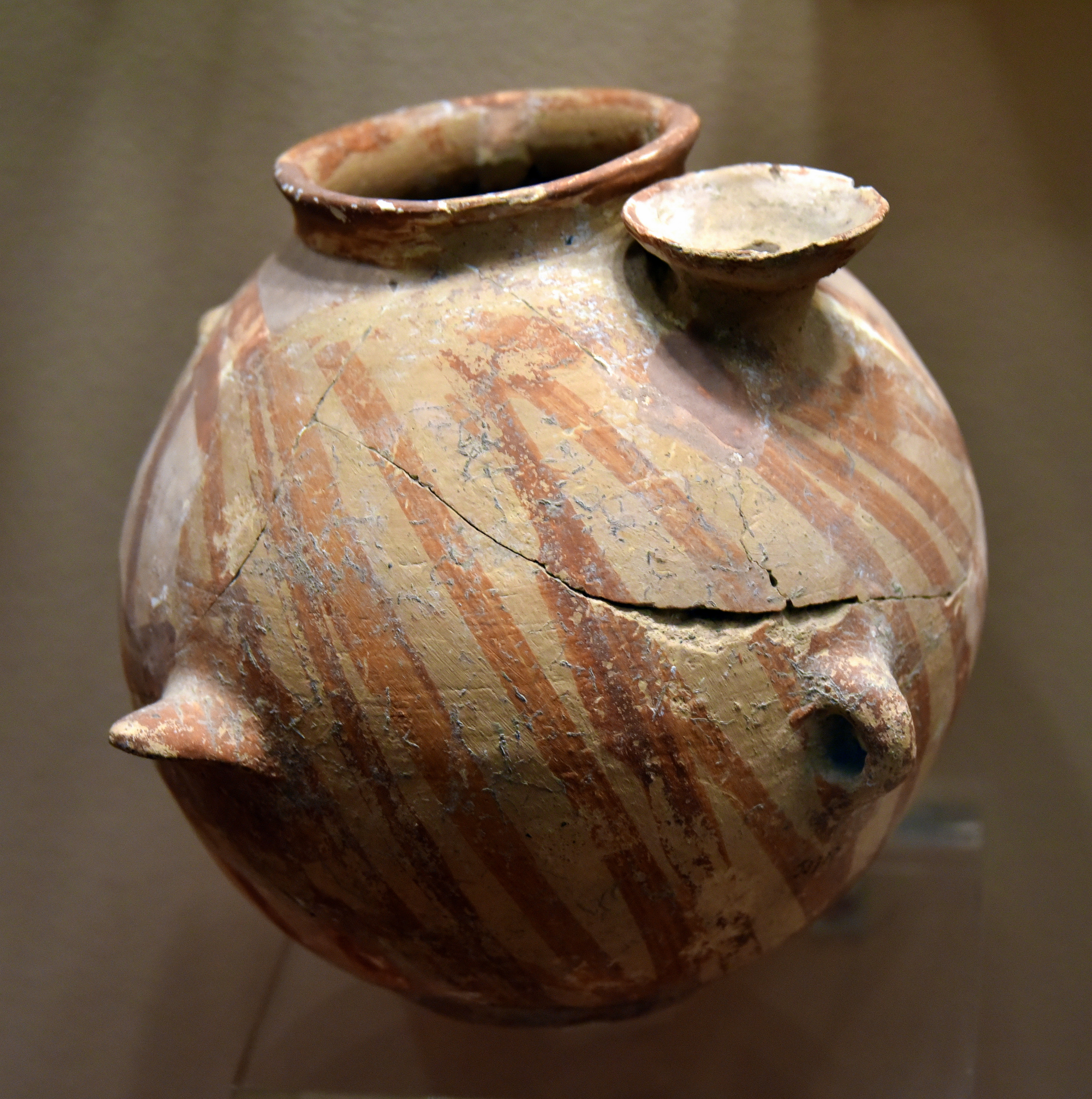 Jar decorated in red, like a burnished slip or groups of lines The spouts applied to some jars may have served as stands for dipper juglets. Early Bronze Age, 3600-3100 BCE. From Arqub az-Zahr, Jordan. (The Jordan Museum, Amman, Jordan).