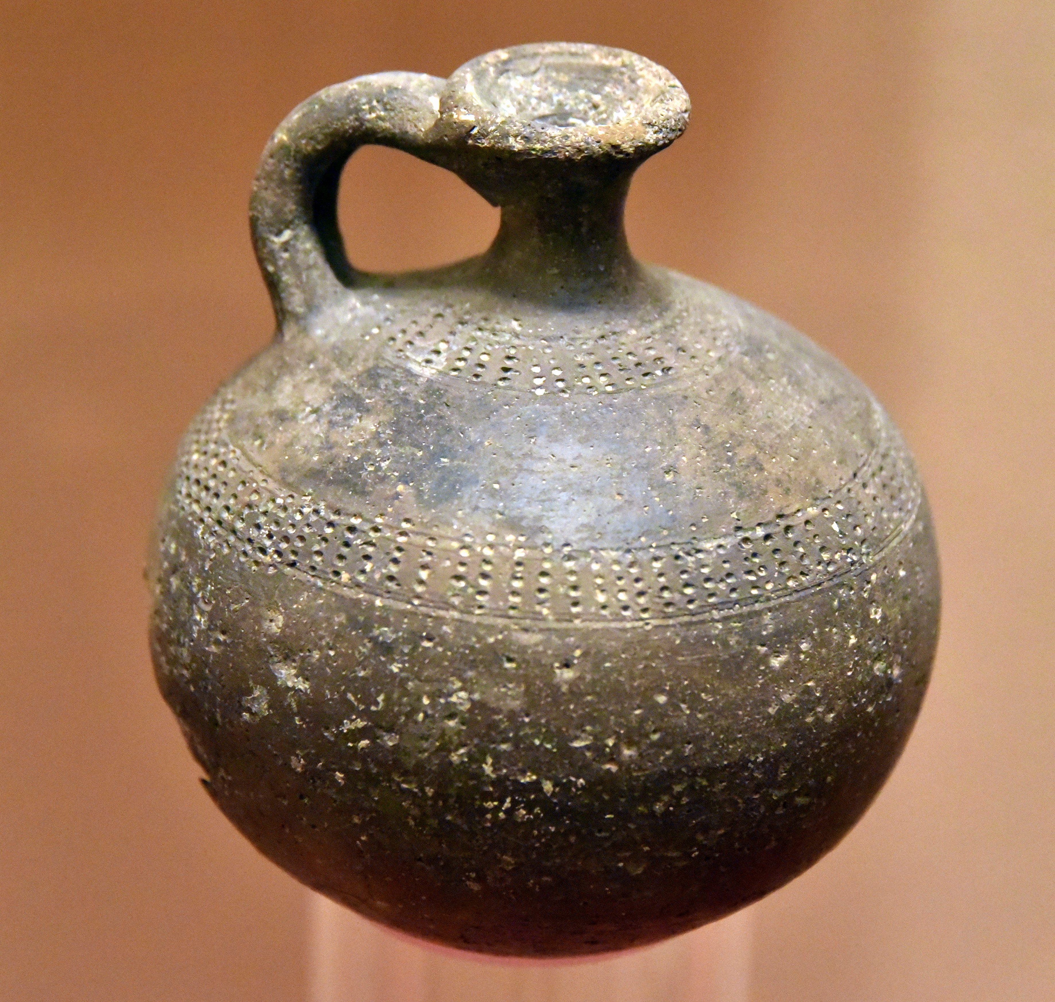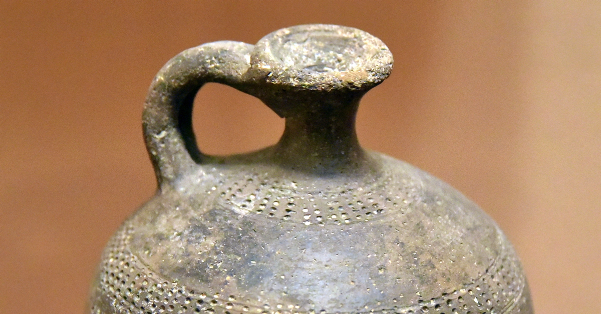 These distinctive small juglets belong to the "Tell el-Yahudiyeh Ware", named after the Egyptian site where they were first discovered, although this type of ware was produced elsewhere. The juglets are of a dark color, burnished black or dark brown, and decorated with fine impressed dots which were filled with white lime. Generally, juglets of this type are small with pointed bases, thus requiring support. The type also includes some animal-shaped vessels. Middle Bronze Age, 1800-1650 BCE. From Jabal al-Jawfa in Amman, Jordan. (The Jordan Museum, Amman, Jordan).