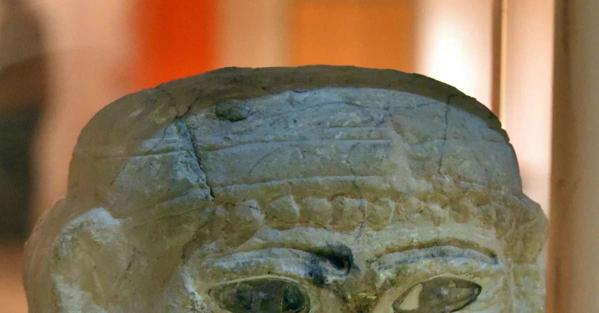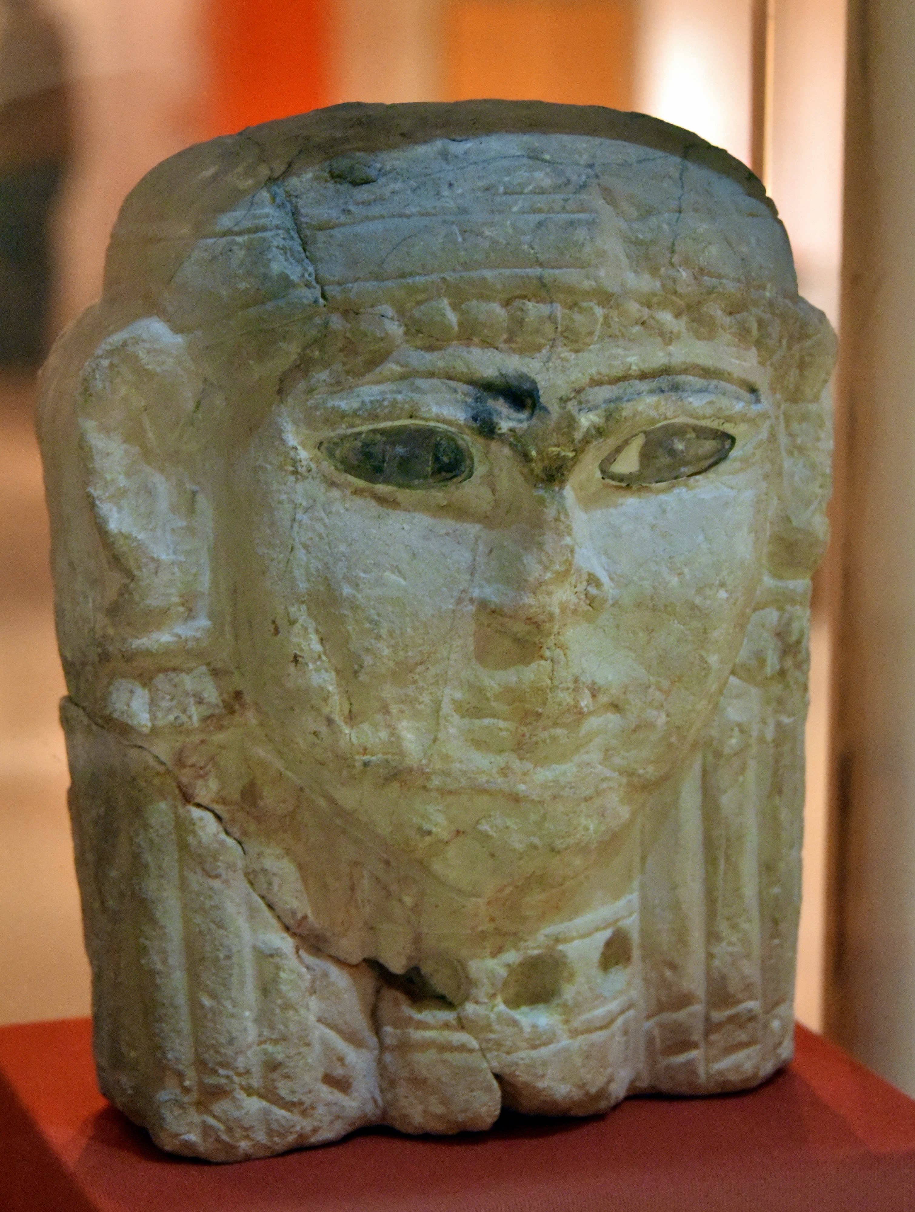 This limestone head probably represents the goddess Astarte. Some of the ivory inlays still remain within the eye sockets while holes on the collar were probably for inlay decorations. Four such heads were discovered together in 1968 CE and a fifth one was found in 2011 CE. They have holes on the top and bottom and were probably set as a balustrade in the window of an Ammonite temple, to give a chance to devotees praying outside to see one face, while priests in the holy interior could see the other face. Iron Age II mid-8th century BCE. From Amman Citadel, Jordan. (The Jordan Museum, Amman, Jordan).