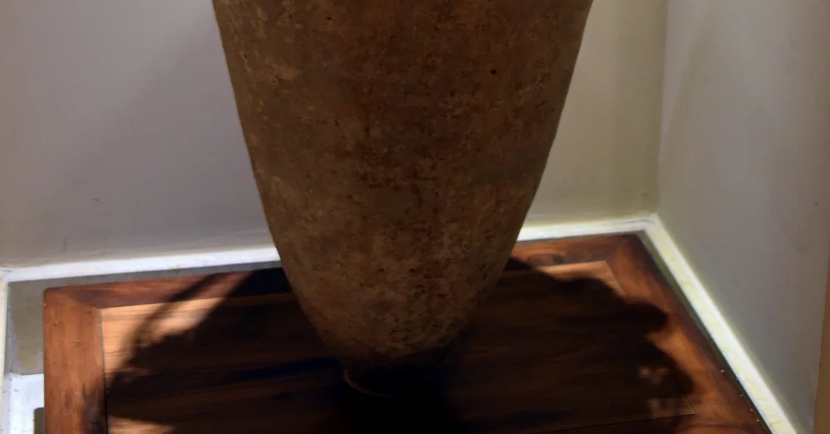 Large jar built up with coils of clay and then trimmed upside down on the wheel. Its base is tapered making the form similar to a plumb-bob when hanged by the handles. This type of jar was commonly associated with administrative and trade centers where large quantities were transported or stored. The form of the jar indicates that it was made to contain liquids. Two rectangular holes in the upper body were cut after firing, probably for ease of emptying the liquid when tilting. Iron Age II, 9th to 8th century BCE. From Umm al-Qanafidh in Madaba, Jordan.