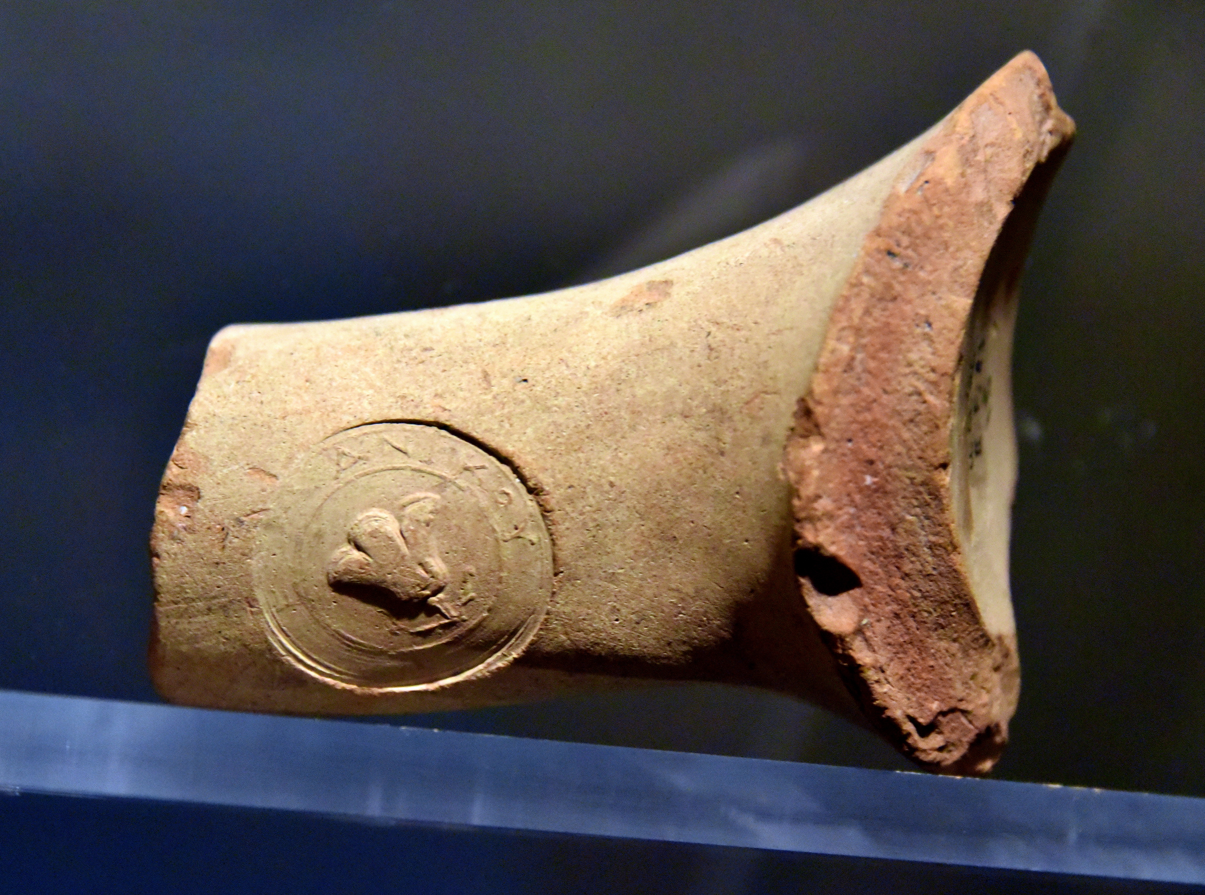 Stamps on pottery vessels may refer to the makers or owners. They may also be trademarks that record capacity or content. The handles of amphorae from the Mediterranean island of Rhodes carried stamps indicating the quality of their contents of luxury wine, which was exported throughout the Mediterranean and as far as India. They bore the potter's stamp, the island's symbols, and even the manufacturing license and the name of the responsible official. Hellenistic period, 300-100 BCE. From Jordan. (The Jordan Museum, Amman, Jordan).