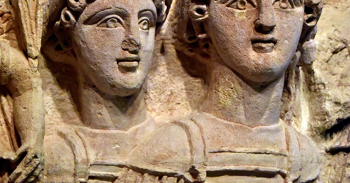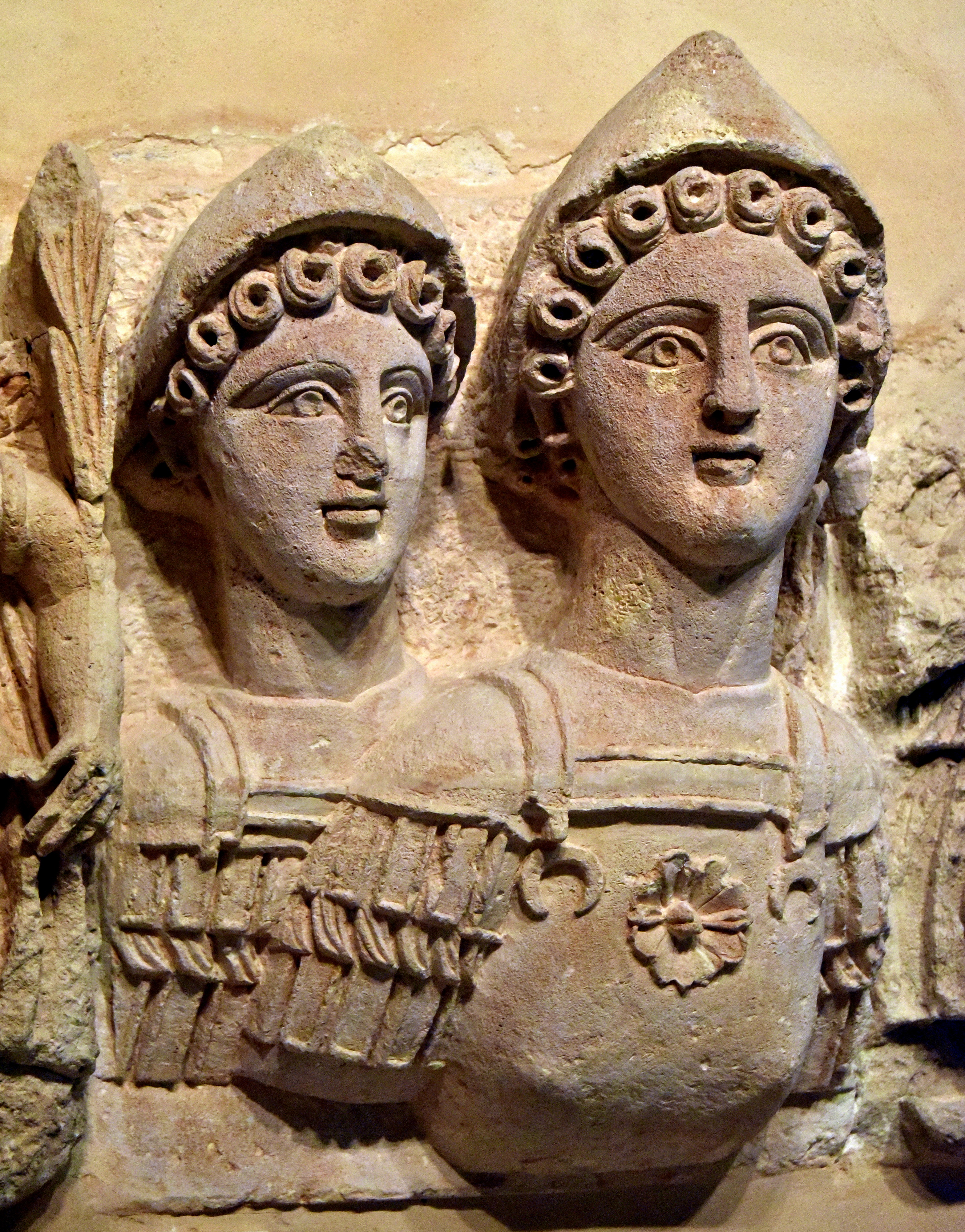 This sculpture of Gemini was part of the temple's facade. The temple was designed according to classical fashion. It contains major constitutional elements of the classical architectural order, but its decoration was not classical at all. The temple stood up to 15 meters high and was built in the Nabataean village of Khiribt Adh-Dharish, around 100 CE. The frieze above the architrave had figures of the Zodiac alternating with winged Victories, who crowned these Zodiac figures. The discovered Zodiac figures were Taurus, Gemini (also known as Dioscuri), Cancer, Libra, and a fragment of a cuirassed Saggitarius; the others were very badly damaged or missing. Is the Zodiac depicted here a sign of an astral Nabataean cult, or does it represent the local adoption of the zodiacal calendar that was known in several contemporary cultures? (The Jordan Museum, Amman, Jordan).