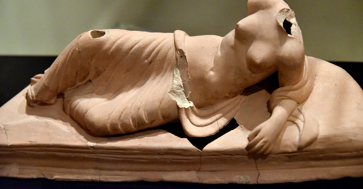 Terracotta figurine of the goddess on a large couch (cline), leaning on her left elbow. This was the typical position for dining at a banquet (symposium), which was derived from the Greek tradition and was adopted by the Romans. The hole in the upper surface of the right knee possibly was a place to insert a lamp. Roman period, mid-2nd century CE. From Jerash (Gerasa), Jordan. (The Jordan Museum, Amman, Jordan).