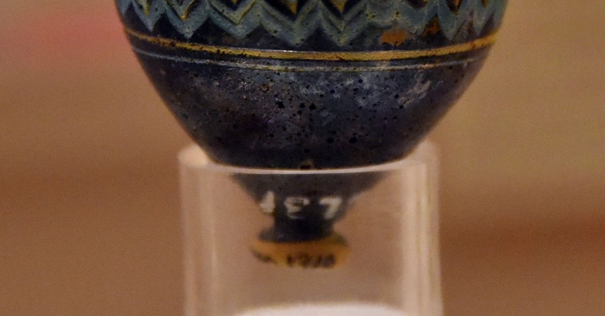 An amphoriskos is a small amphora, typically less than 4 inches in height. Polychrome and sand-core formed. The decoration and the technique used are very similar to Phoenician glass, reflecting the trade and cultural exchanges across the Mediterranean basin. Achaemenid period, 6th to 5th-century BCE. from Umm Udhayna, Amman, Jordan. (The Jordan Museum, Amman, Jordan).