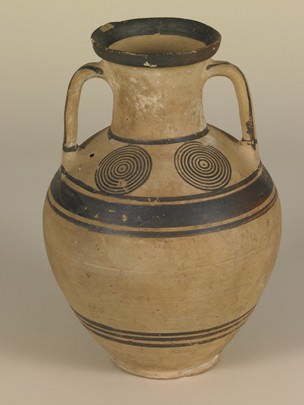 The Proto-geometric style (1000-900 BCE) of Greek pottery decoration was a forerunner of the full Geometric style. This amphora dates from the first half of the 10th century BCE and displays the popular circle design. These were achieved using multiple fixed brushes attached to a compass. Also typical of the style are the plain black horizontal bands. (British Museum, London).
