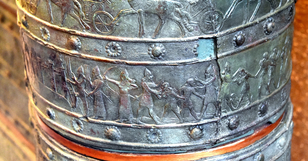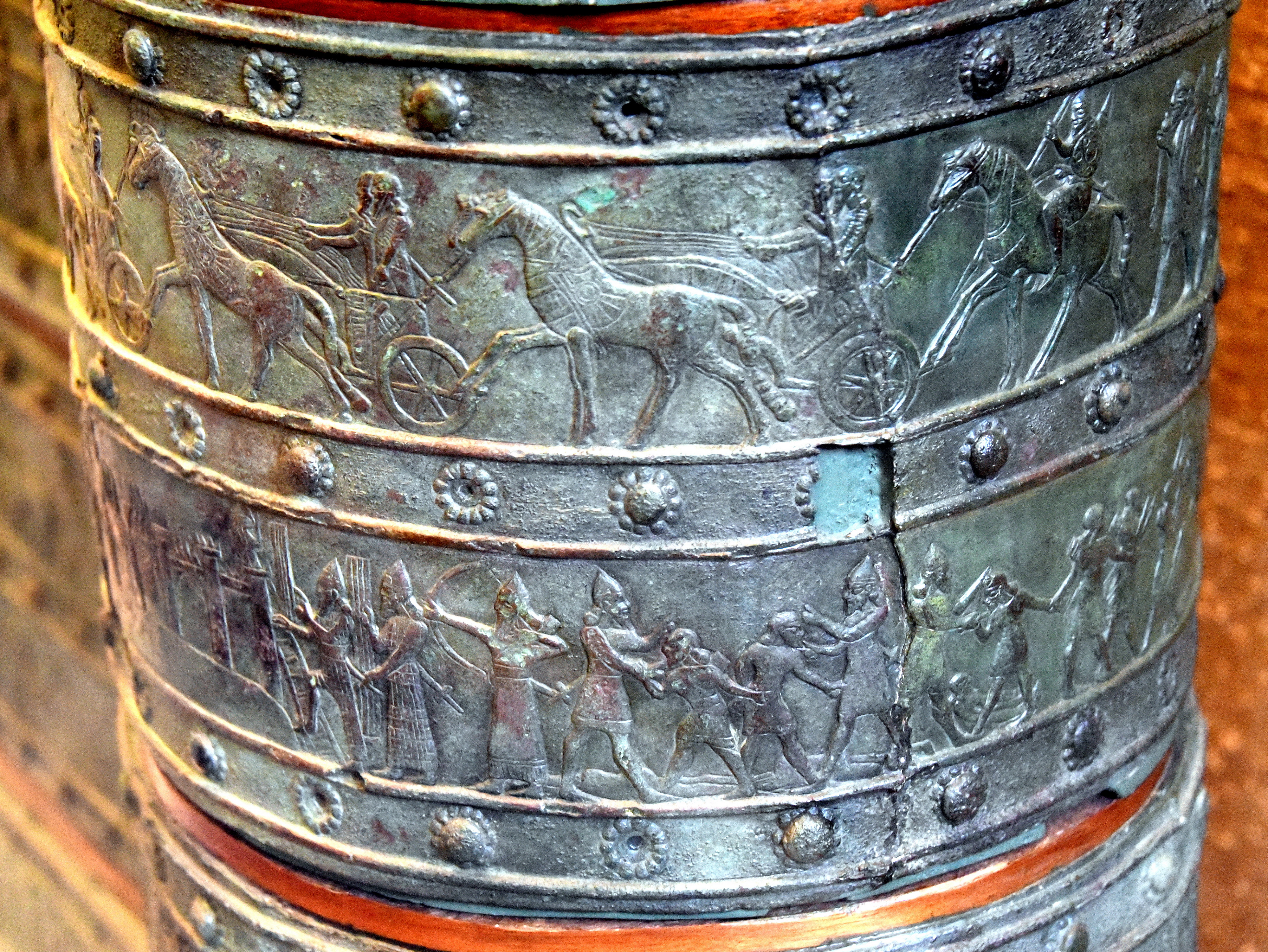 The upper register shows Assyrian chariots and cavalry (and two officers) while the lower register shows the slaughtering of men from the city of Khazazu. Shalmaneser III's military campaign in Phoenicia, c. 859 BCE. Detail, bronze band from the Balawat gates. Embossed. Original (not an electrotype copy). From Tell Balawat, in modern-day Nineveh Governorate, Iraq. Reign of Shalmaneser III, 858-854 BCE. (The British Museum, London). Source of the description of the band: King L. W. (1915) Bronze Reliefs from the Gates of Shalmaneser King of Assyria BC, 860-825. London.