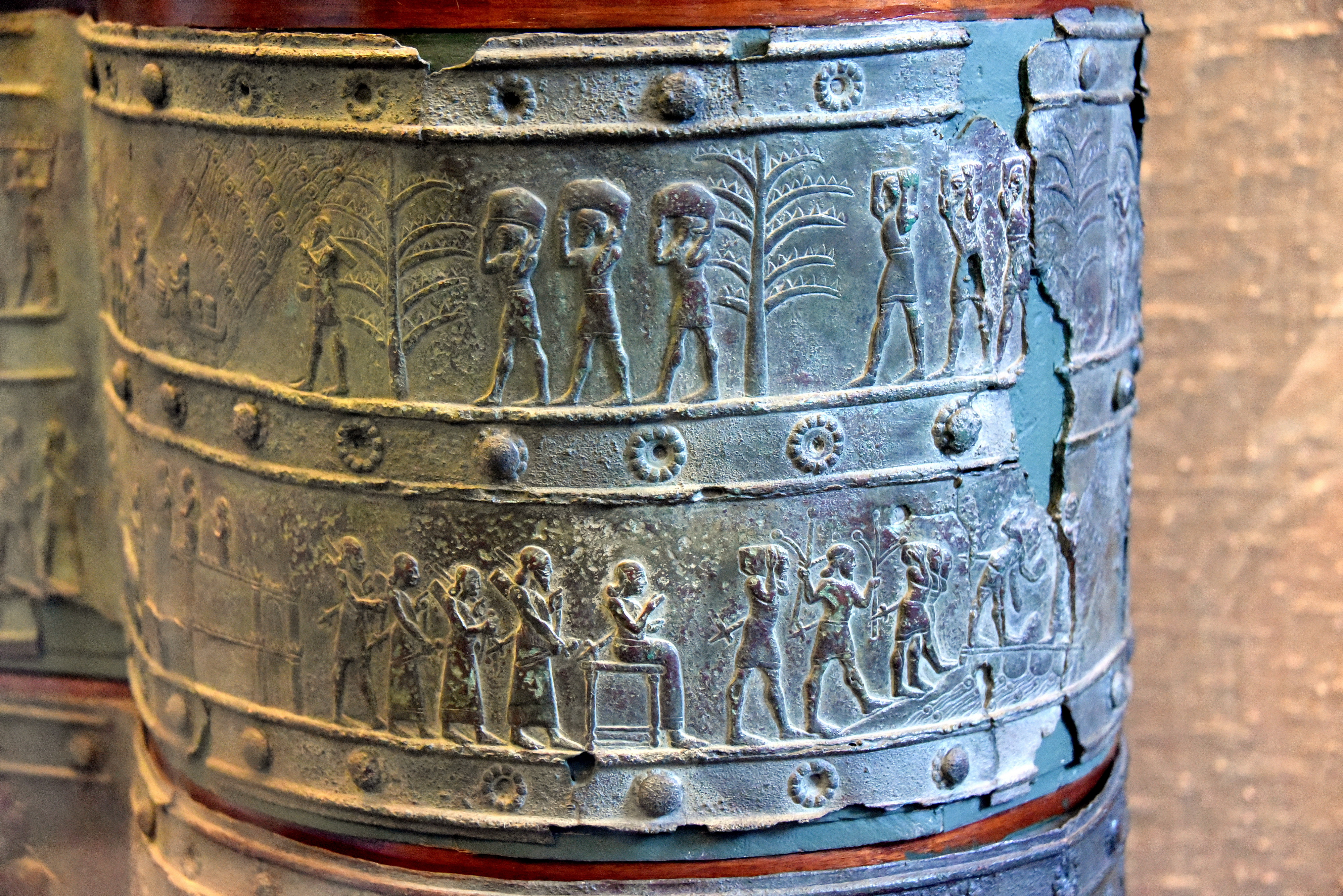 The upper register shows Chaldeans from the city of Bit-Dakuri carrying tribute through a palm-plantation while the lower register shows an Assyrian inspector, seated (center), watching the collection of tribute at a bridge of boats (extreme right). Shalmaneser III's military campaign in southern Babylonia, c. 851 BCE. Detail, bronze band from the Balawat gates. Embossed. Original (not an electrotype copy). From Tell Balawat, in modern-day Nineveh Governorate, Iraq. Reign of Shalmaneser III, 858-854 BCE. (The British Museum, London). Source of the description of the band: King L. W. (1915) Bronze Reliefs from the Gates of Shalmaneser King of Assyria BC, 860-825. London.
