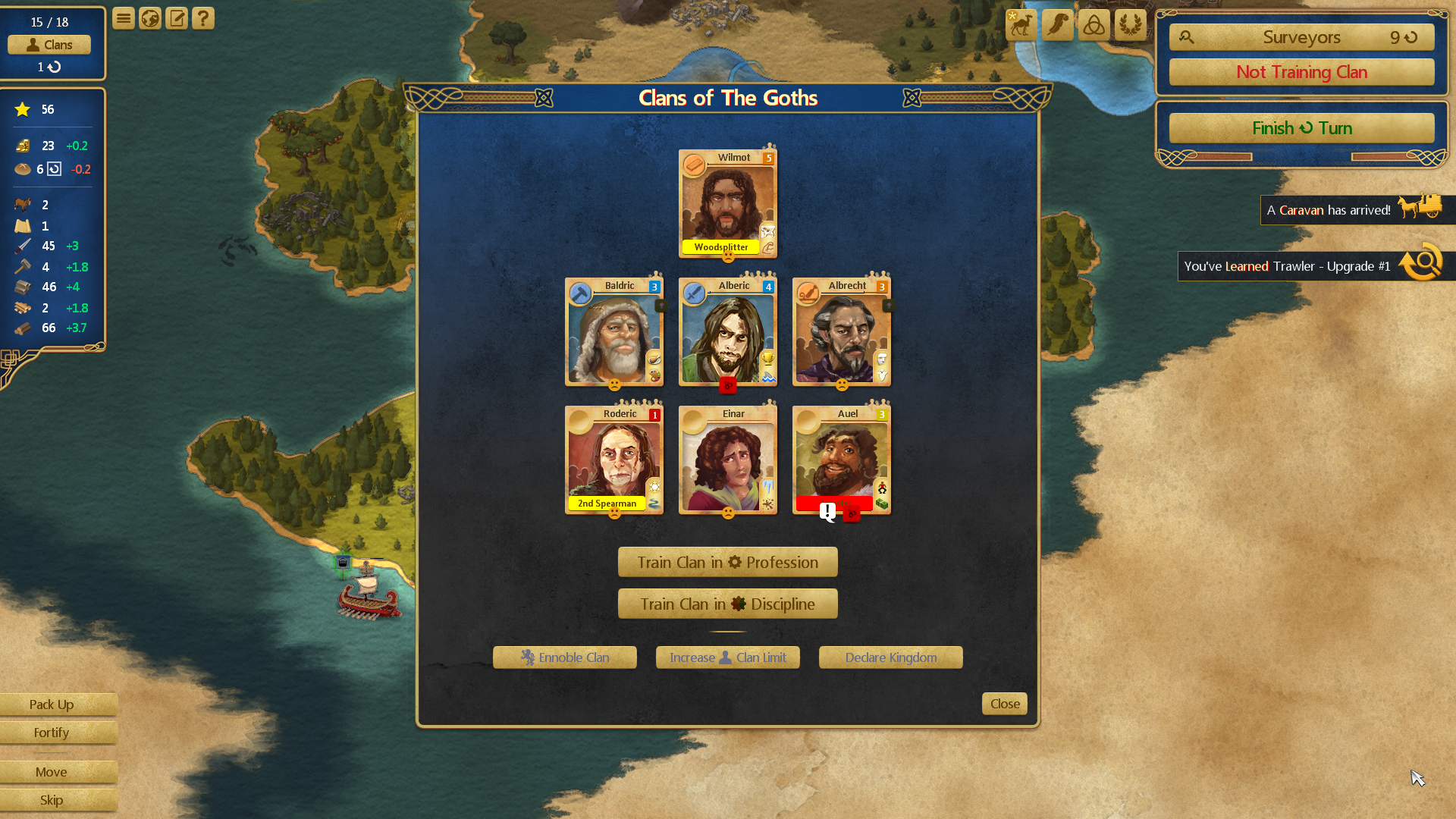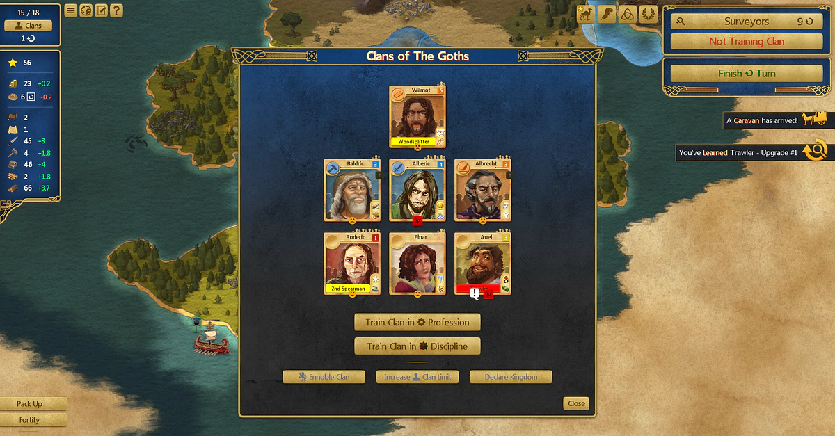 Screenshot of the Clan Screen of the computer game At the Gates by Conifer Games.