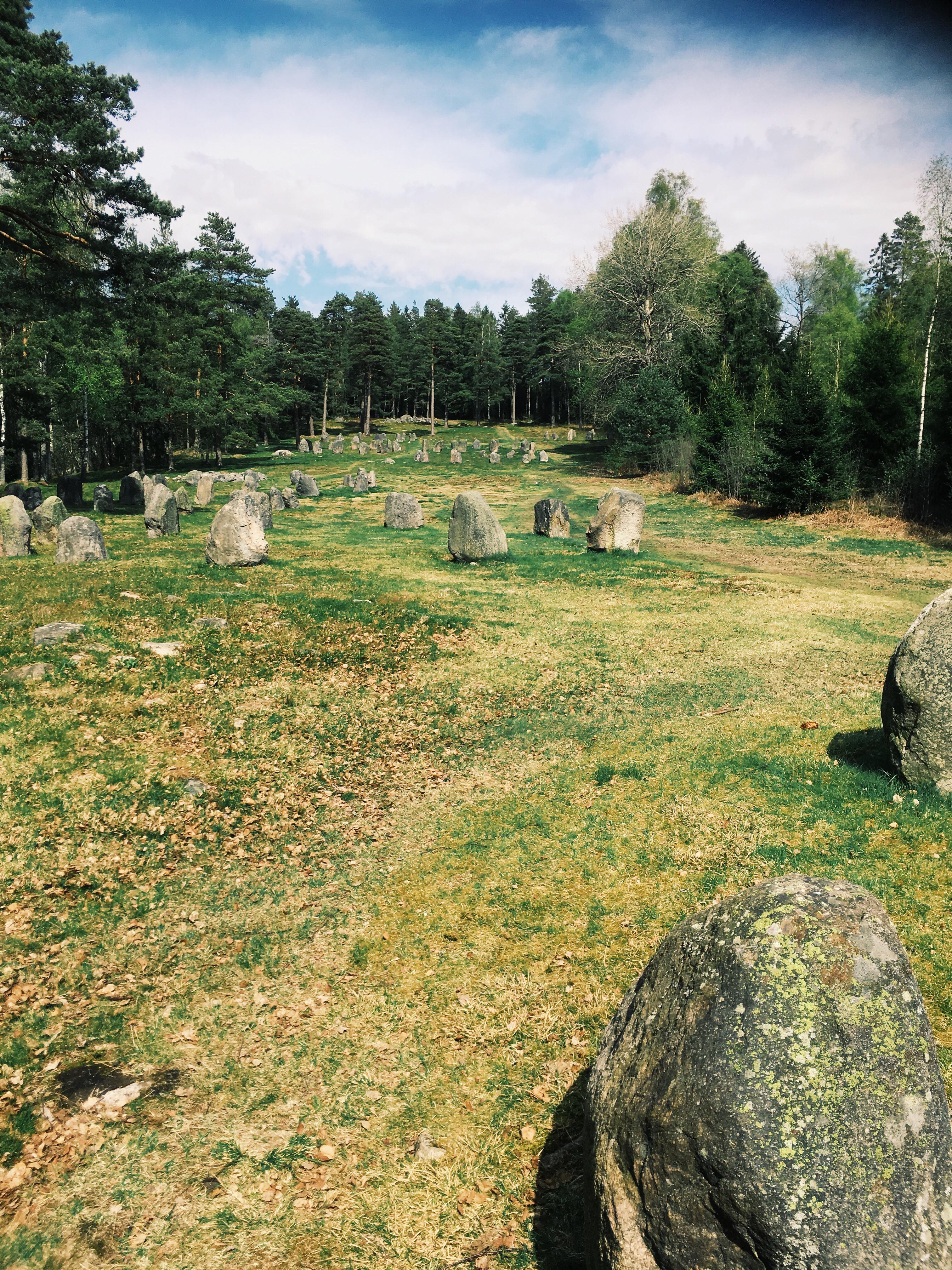 View of the nine stone circles at The Hunnfelt in Østfold, Norway. Dating from c. 500 BCE to c. 900 CE.