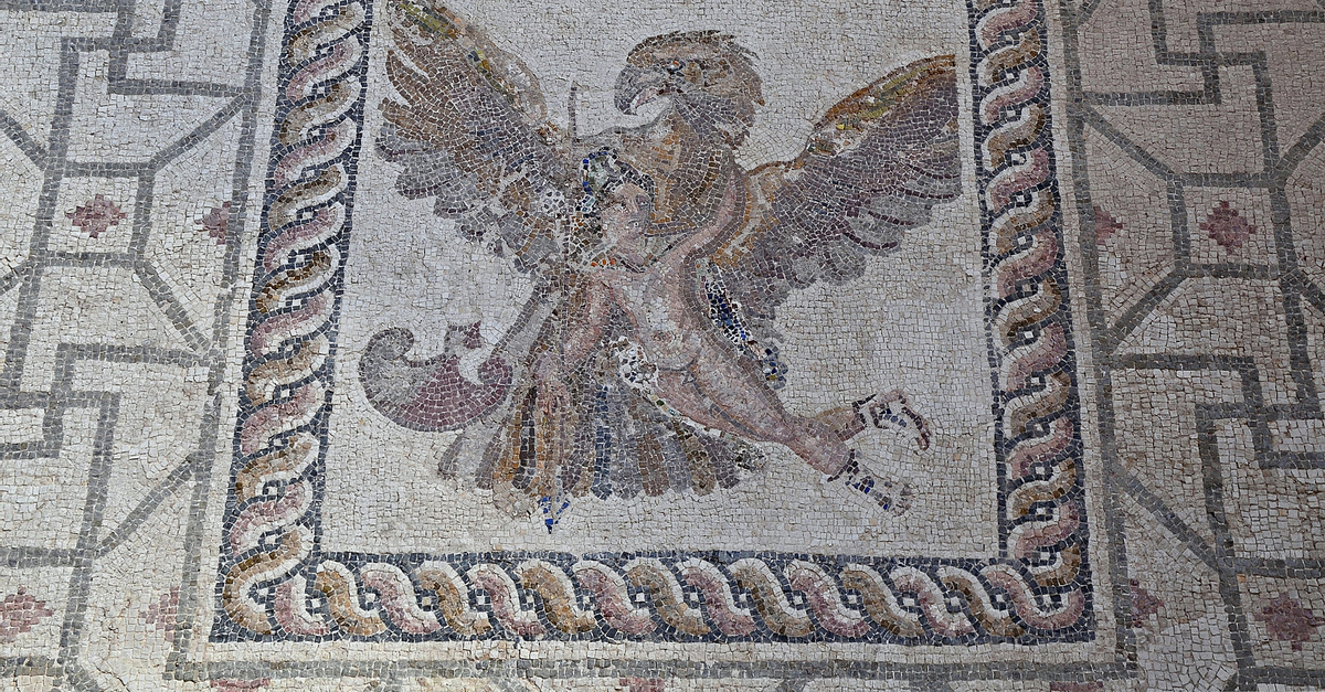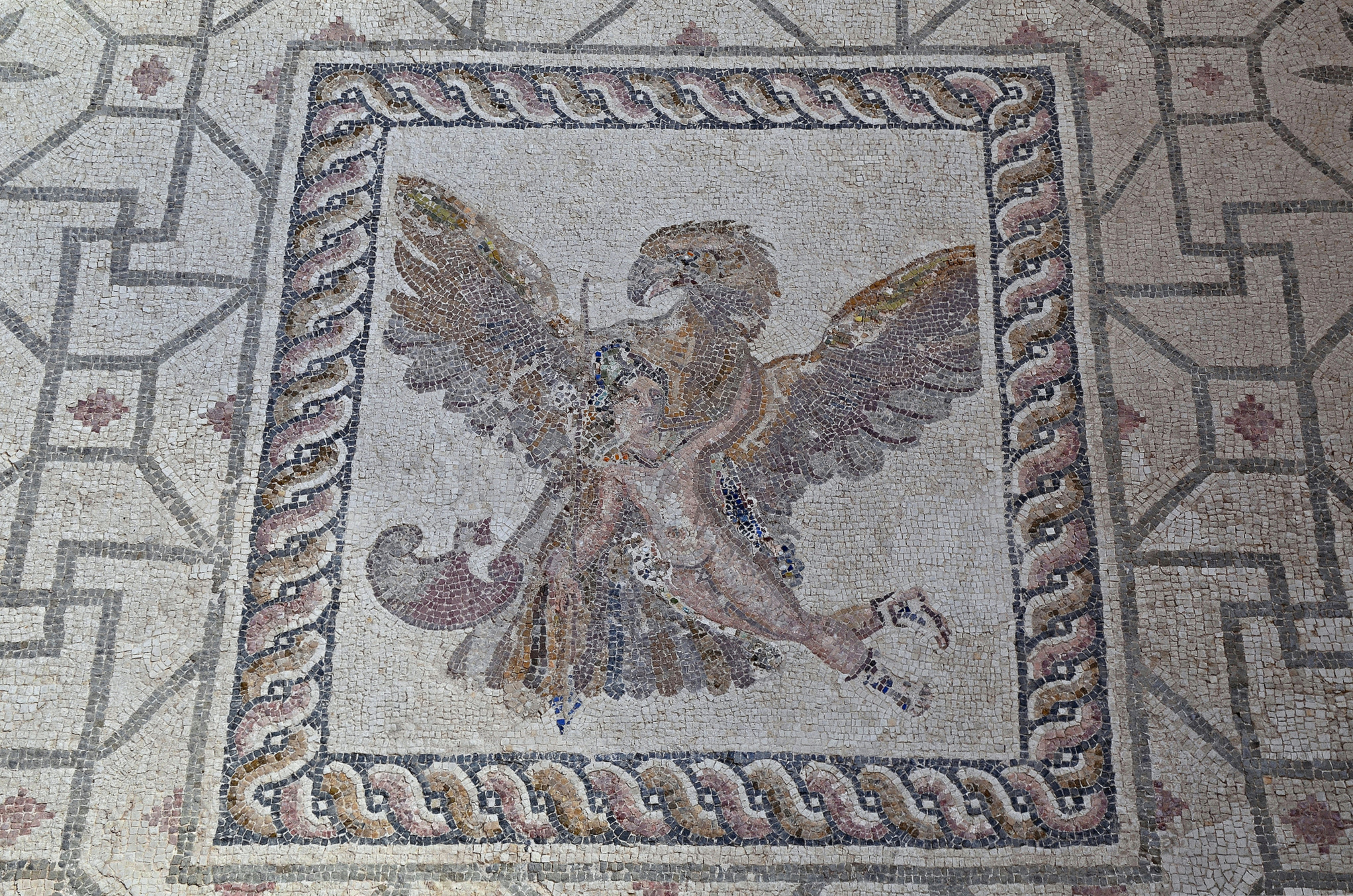 Mosaic depicting the Rape of Ganymede. The god Zeus having transformed into an eagle carries Ganymede away. Late 2nd / early 3rd century CE, House of Dionysus, Paphos Archaeological Park.