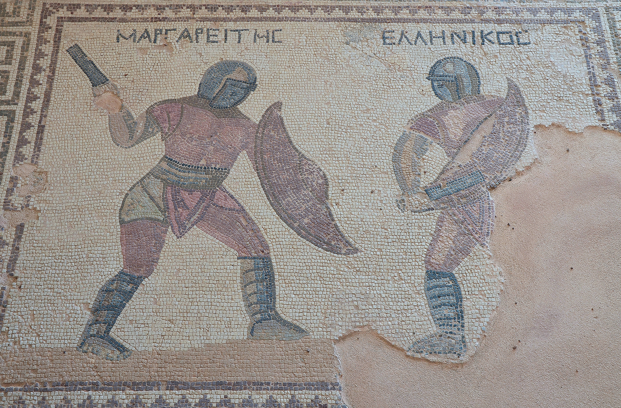 Mosaic depicting two gladiators in combat. Their names in Greek are listed above them: Margarites (left) and Hellenikos (right), late-3rd century CE. House of the Gladiators in Kourion, Cyprus.