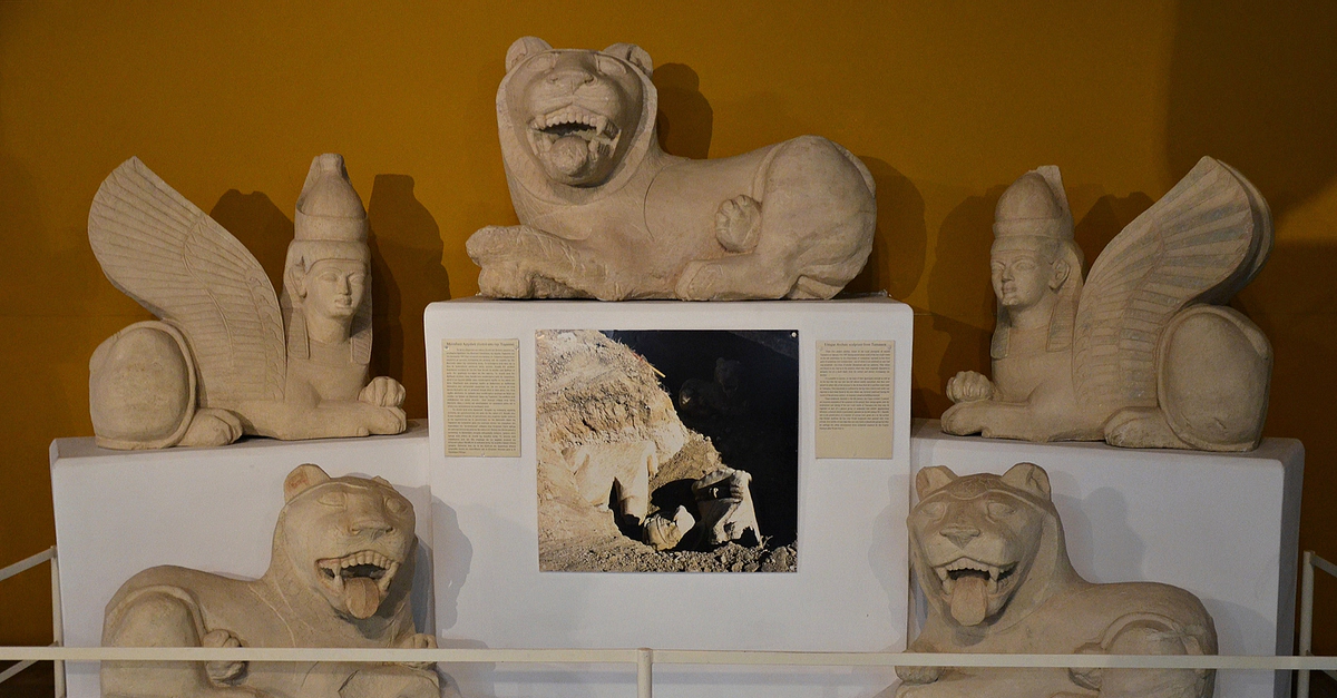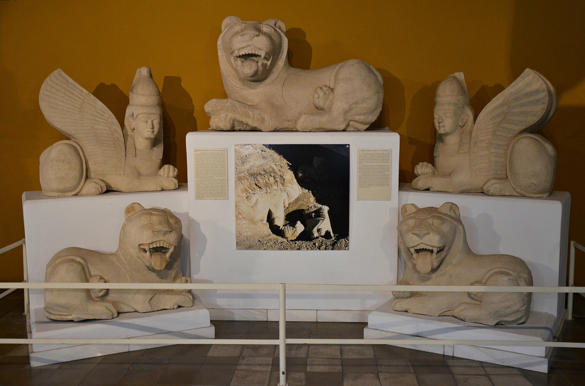 Five unique Cypro-Archaic sculptures found in situ in the necropolis of Talmassos, one oversize lion, two lions of smaller dimensions and two sphinxes. 6th century BCE (Cypro-Archaic II period). Cyprus Museum, Nicosia.