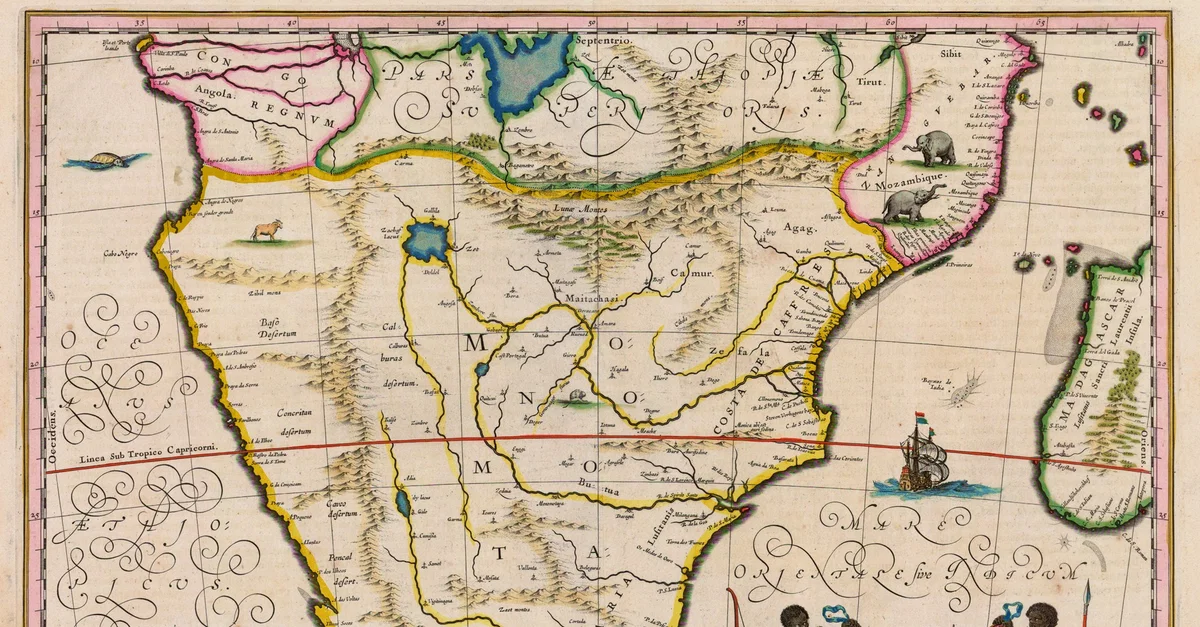 A 1635 CE map of southern Africa by Willem Janszoon Blaeu. It shows the kingdom of Monomotapa (aka Mutapa), although it inaccurately shows the kingdom's spread over a far larger area than it actually controlled around the Zambezi River.