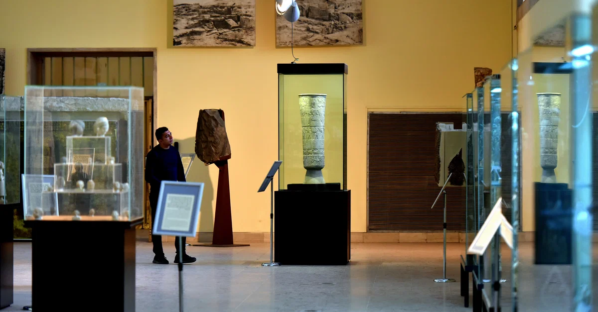 A young man stands before and skims the votive Vase of Warka, one of the priceless objects in the Iraq Museum and represents one of the earliest surviving narrative art. The man was included in the image for comparison with the Vase's size and height. It was excavated (in fragments) by a German excavation team in a temple complex dedicated to the goddess Inanna at the city of Uruk (in southern Iraq) in 1933-1934 CE. It is about 1 meter tall. It was looted from the Iraq Museum somewhere between April 10 to 12, 2003 CE. The display case was toppled and broken and then the looters detached the Vase from its reconstructed base. On June 12, 2003 CE, a group of three unidentified young men approached the Iraq Museum's security gate, driving a red Toyota car. They lifted a blanket from the car's boot, wrapping 14 pieces of the Warka Vase. They handed them to the Americans and then they disappeared. The base and upper margin suffered significant damage. From Warka (ancient Uruk), Iraq. Jemdet Nasr Period, 3000-2900 BCE. On display, Sumerian Gallery, at the Iraq Museum in Baghdad, Republic of Iraq.