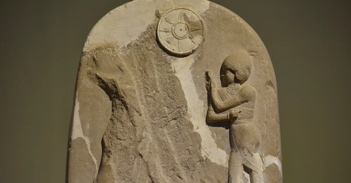 This detail shows the upper register of the stele of Dadusha. The stele is an elongated stone monument which originally stood at the Temple of Adad at Eshnunna. The front side is carved with four registers while the narrow sides were inscribed with 220 lines of a cuneiform text divided into 17 columns. The stele was found accidentally in 1983 CE while digging out a well in the outskirts of ancient Eshnunna (modern-day Tell Asmar) in Diyala Governorate, Iraq. The center of the front side was damaged during the discovery. This is the upper register (the image of heroism) which shows Dadudha (left) in a position of a slayer, tending on the defeated and slain king of Qabara, Banu-Ishtar. A standing male figure (right) adores Dadusha; this is probably a crown-prince or a military general. The sun-disc with its rays of Shamash, combined with the crescent of Sin, appears at the central upper part. At the bottom of the image, the city walls of Qabara appears. Dadudha was a king of Eshnunna and this stele commemorates his victory over the city of Qabara in Arbela (modern-day Erbil, in Iraqi Kurdistan) and its king Banu-Ishtar, with the help of king Shamshi-Addu of Ekallatum. Old-Babylonian period, 1830-1760 BCE. It is on display at the Iraq Museum in Baghdad, Republic of Iraq.