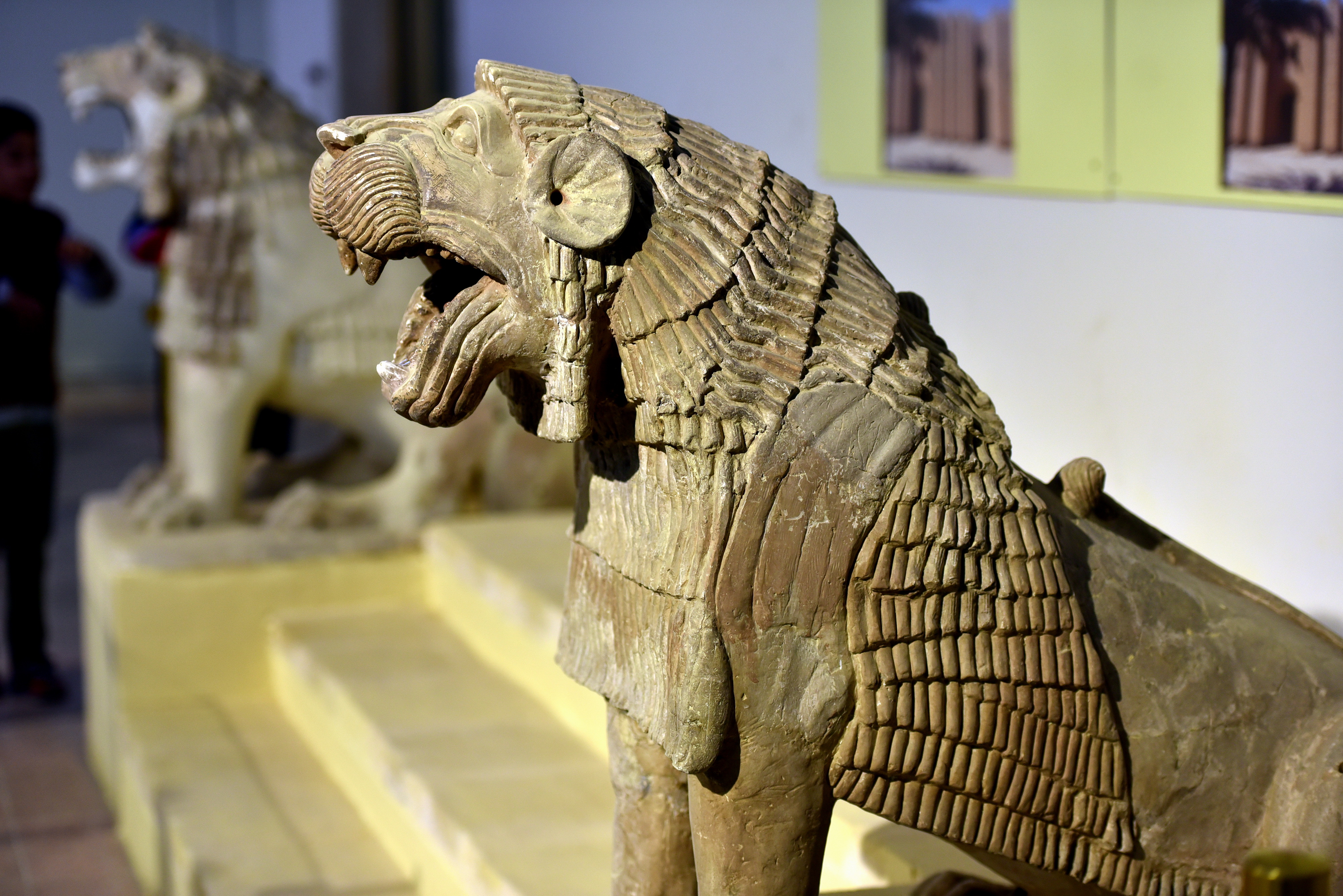 The temple was a typical Old-Babylonian one, with a short staircase made of mudbricks and flanked by platforms, on which those lions once stood. The lions were constructed from many fragments and probably the two lions date to different periods. The gaping jaws and bristly manes would avert any evil from entering the temple. The temple was dedicated to Nisaba (goddess of the grain and writing) and her consort, Haja. This lion (close to the viewer) was safe and intact during the ransacking of the Iraq Museum in April 2003; however, the other lion was vandalized by the looters and was restored afterwards. Both lions were made of baked and moulded clay (with a hollow interior).