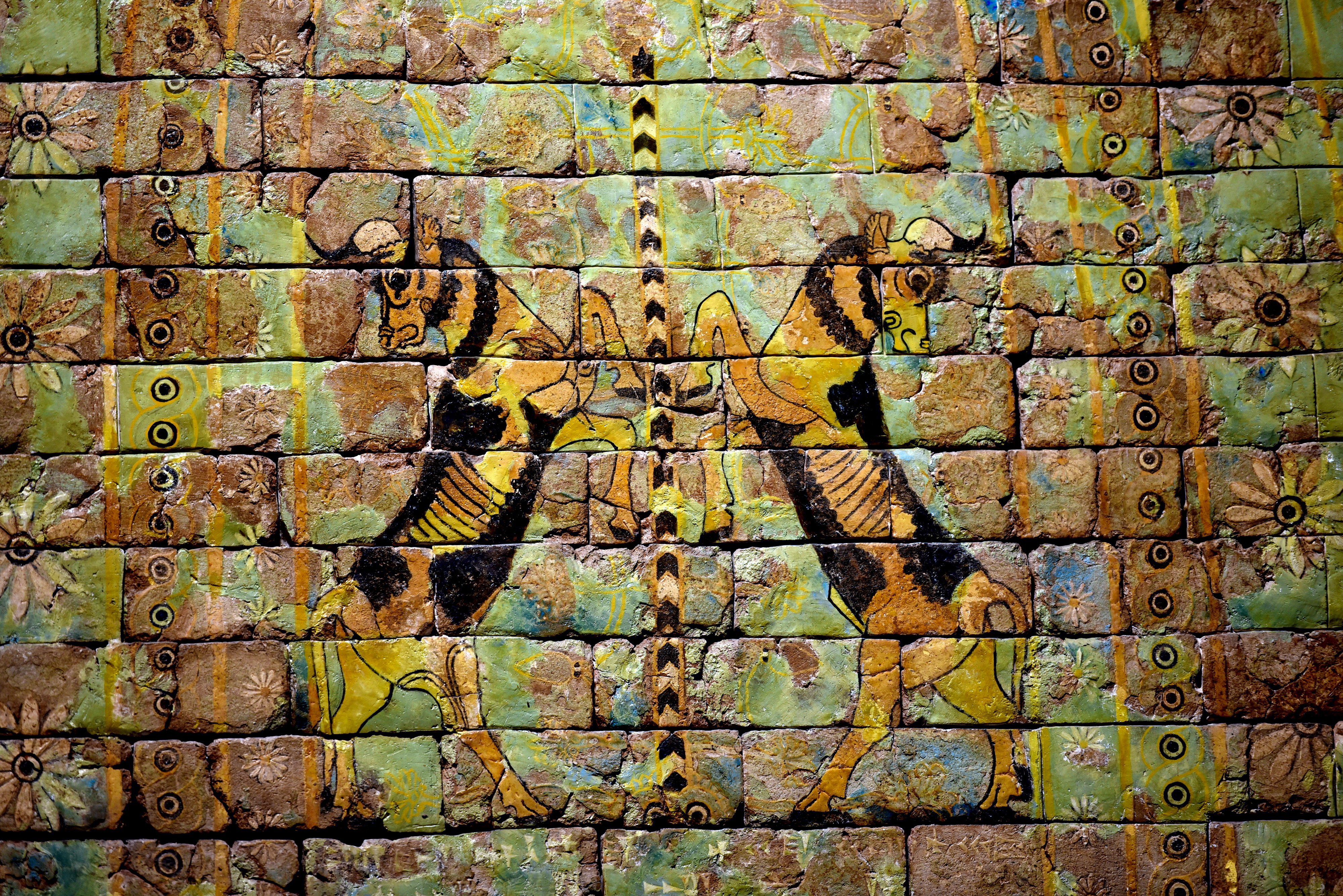 Detail of a large wall panel of vibrant glazed bricks once placed above the entrance to a vast room (T3) next to Shalmaneser III's throne room. The whole panel is composed of about 300 bricks and is 4 meters in length; this detail at the center depicts two rampant bulls around a sacred tree. Fort Shalmaneser in Nimrud, modern-day Nineveh Governorate, Iraq, reign of Shalmaneser III, 858-824 BCE.