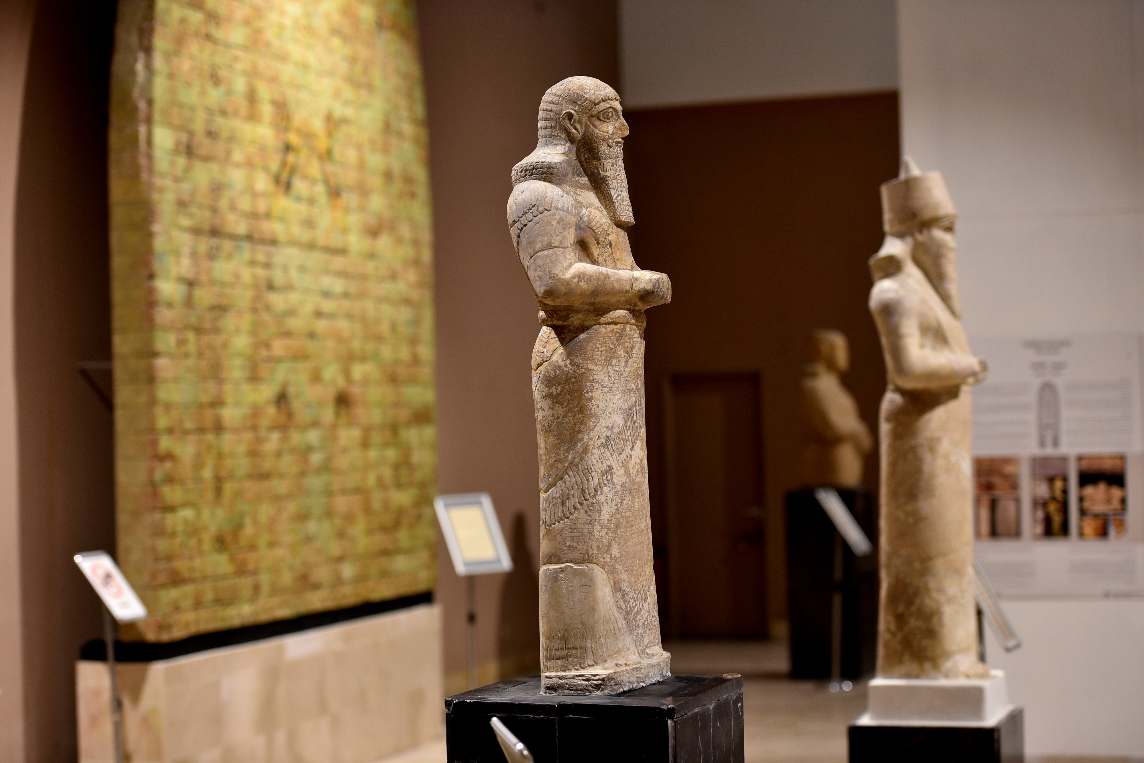 In the centre of this image is the so-called Kurba'il statue of Shalmaneser III (reigned 858-824 BCE), which was found in Fort Shalmaneser in 1961 CE by the British School of Archaeology in Iraq. The statue originally stood in the Temple of Adad at the city of Kurba'il, north of modern-day Mosul, but it was probably brought in antiquity to Fort Shalmaneser for repair, where it was found. The statue's cuneiform inscriptions mention the first 20 military campaigns of the king. Somewhere between April 10 to 12, 2003 CE, this statue was looted from the Iraq Museum. It was retrieved in the following weeks, in 4 fragments (head, and 3 body parts). The statue on the right also belongs to Shalmaneser III and was found by a peasant accidentally in the early spring of 1956. It was badly fragmented at the south-east corner of Nimrud city wall, at the foot of the acropolis. The statue's cuneiform inscriptions mention the king's 21st and 22nd military campaigns. On the left, the vibrant glazed wall panel from Fort Shalmaneser appears. All date back to the reign of Shalmaneser III and are on display at the Assyrian Gallery of the Iraq Museum in Baghdad, Republic of Iraq.