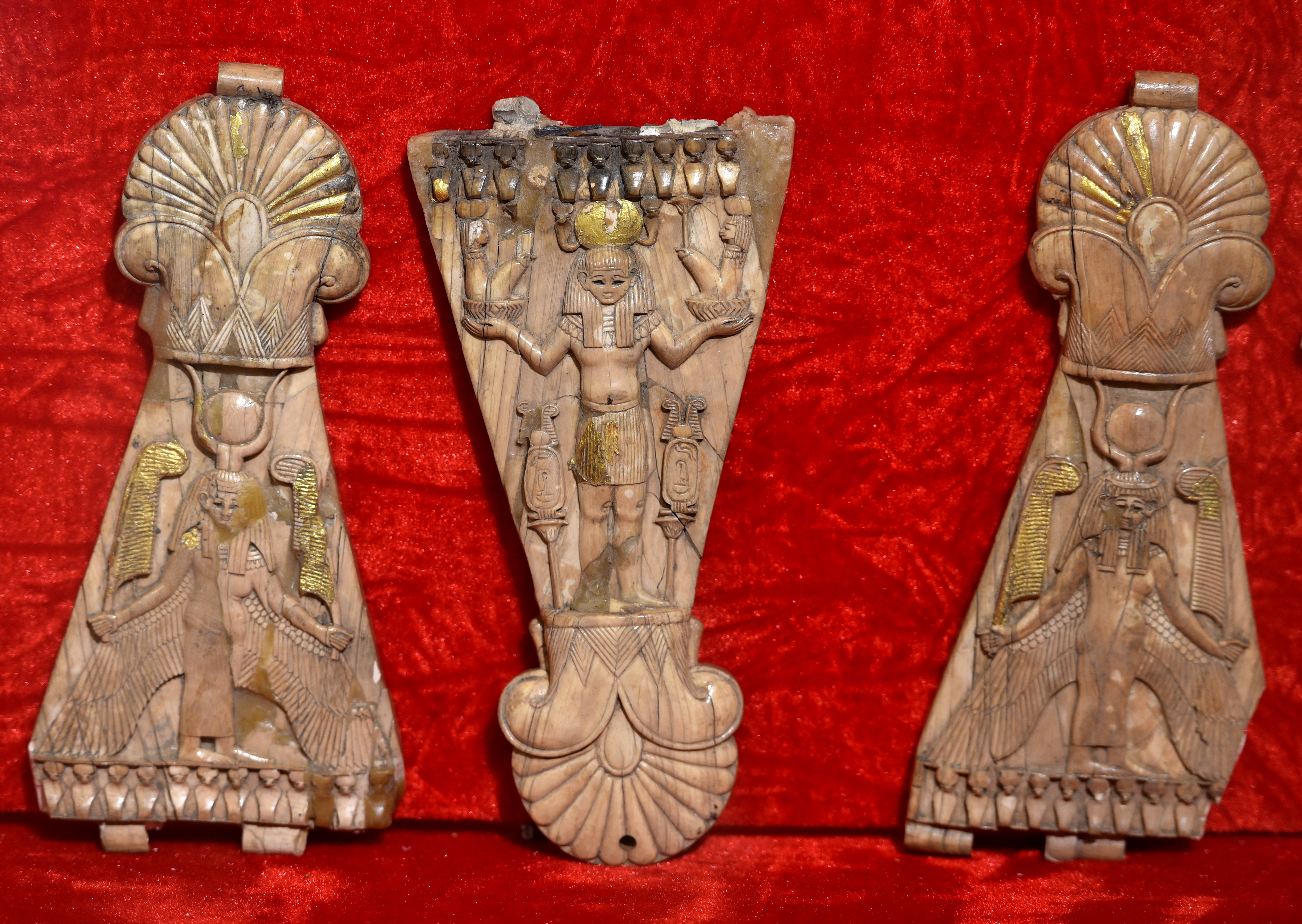 These three frontlets were found inside Well AJ at the North-West Palace at Nimrud (in modern-day Nineveh Governorate, Iraq). They are part of the so-called "Classical Phoenician" hinged frontlets of Group 2. The middle frontlet depicts a central male (deity) figure, wearing a solar disc on his head (flanked by two crowned uraei). He holds with his hand two bowls on which two deities are seated and hold a lotus stem. The central figure is flanked by cartouches (topped by a double-plumed solar disc) sitting on a lotus flower. The frontlet is sub-triangular in shape and the lower part ends in voluted palmette plants. There is a row of uraei at the upper margin. The frontlets on either side represent the upper part of the hinged frontlets. A standing and winged female (goddess) figure wears the Hathor crown on a lappet wing and holds atum feathers in her hands. They are triangular in form, also ending in voluted palmette plants. The lower edge has a row of uraei. Some of the gold overlay is still present on these frontlets. Neo-Assyrian period, 911-612 BCE. They are on display at the Nimrud Ivories Gallery of the Iraq Museum in Baghdad, Republic of Iraq.