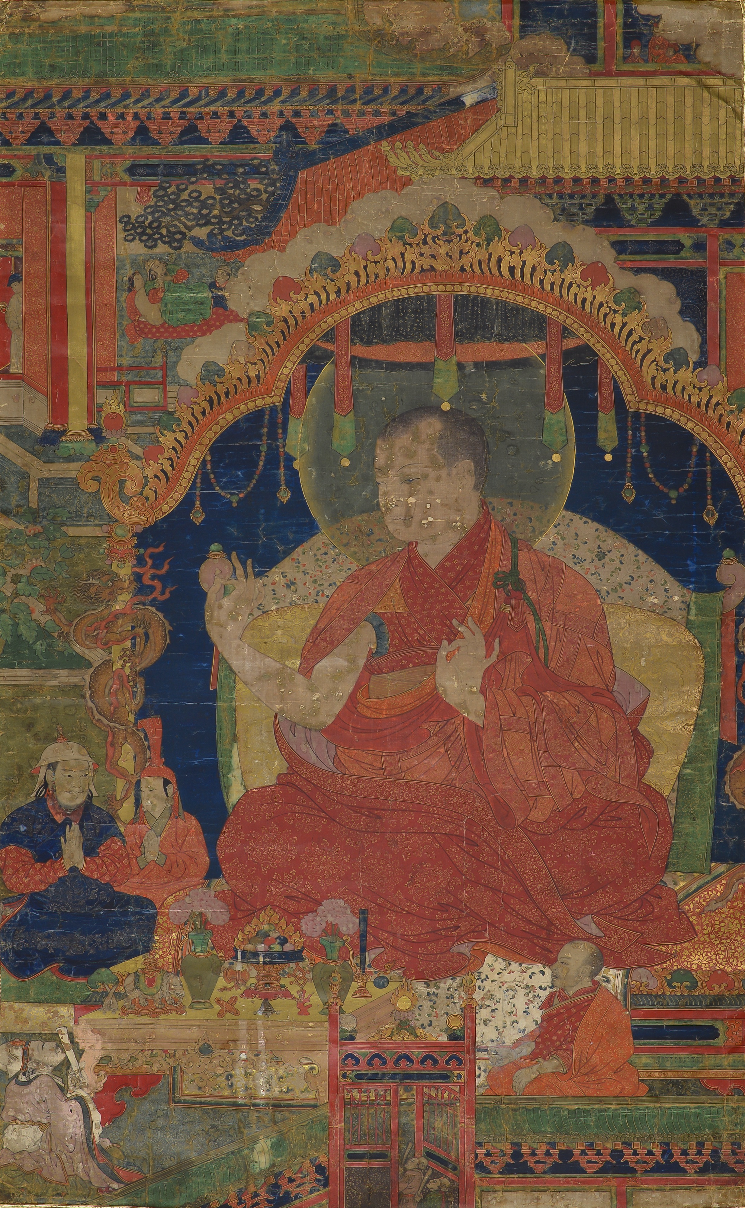 Kublai (Qubilai) Khan Naming Phakpa Imperial Preceptor, c. 1270 CE; attributed to Khyentse Chenmo (flourished 1450s–1490s CE); Tibet; late 15th–16th century CE; pigments on cloth; 32 1/4 x 20 in. (82.6 x 50.8 cm); Art Gallery of Greater Victoria, British Columbia; gift of Mrs. W. W. Ritchie; 1965.068.001; photograph by Stephen Topfer
