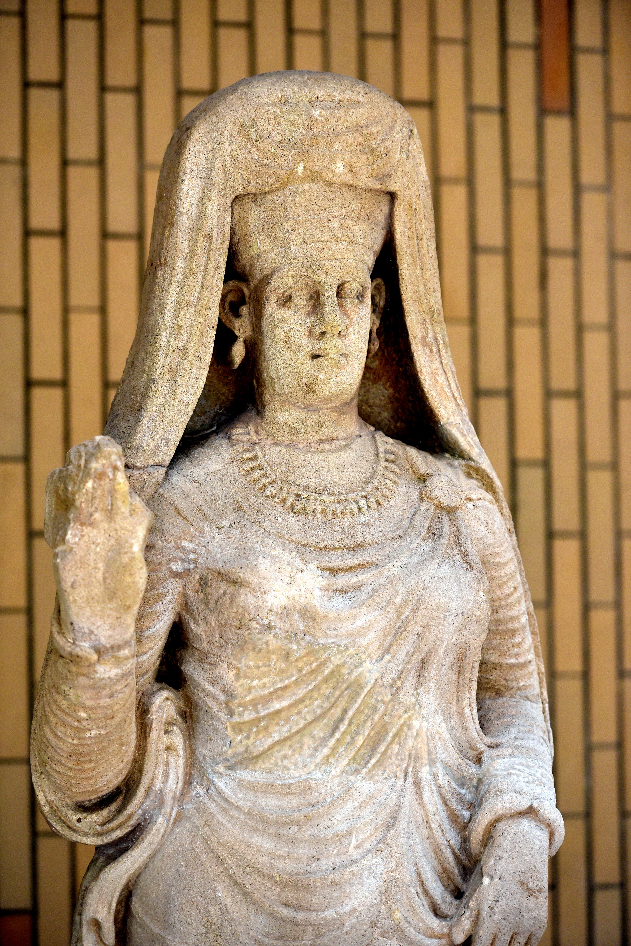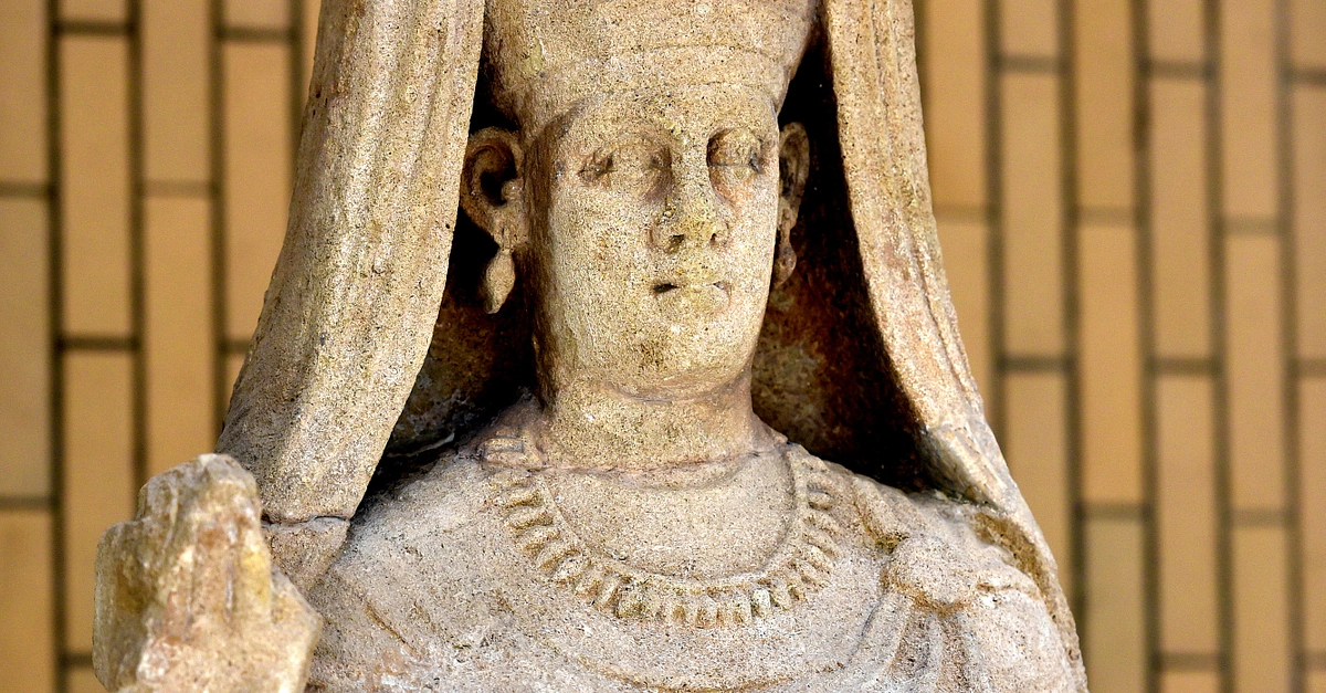 Abu Bint Deimon was the wife of Sanatruq I (reigned c. 140 - 180 CE), king of Hatra. This is a detail of the upper part of the statue. It represents one of the finest sculptures from Hatra. She wears an elaborate headgear, earrings, necklaces, and bracelets. Her right arm is raised in a gesture of greeting while the left hand grasps and lifts up her elegant garment. From the Great Temple at Hatra, 2nd century CE. It is on display in one of the Hatra Galleries in the Iraq Museum, Baghdad, Republic of Iraq.
