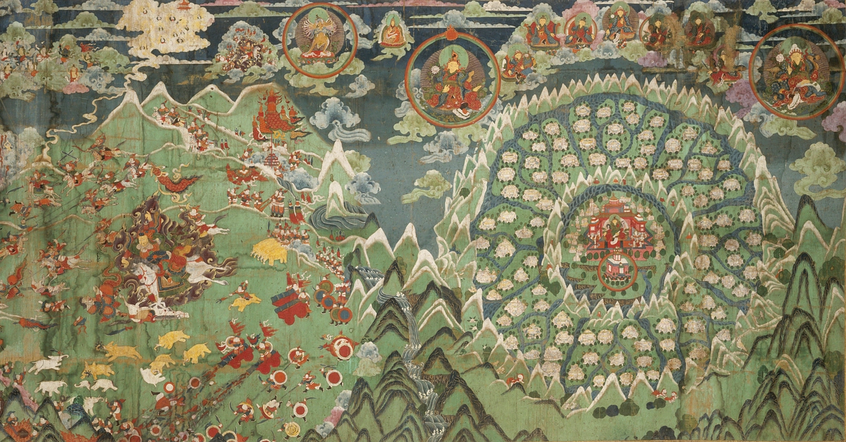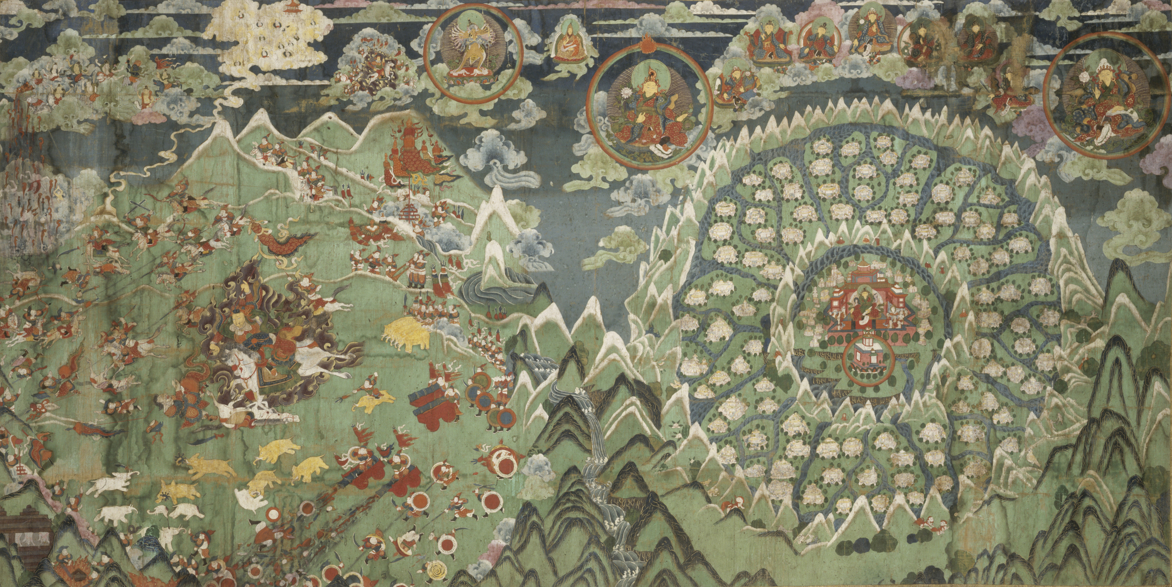 Kingdom of Shambhala and the Final Battle; Mongolia; 19th century; pigments on cotton; 44 x 87 1/2 in. (111.8 x 222.3 cm); Musée des arts asiatiques – Guimet, Paris; MG24416 (HAR 31352); photograph by Thierry Ollivier © RMN-Grand Palais/Art Resource, NY