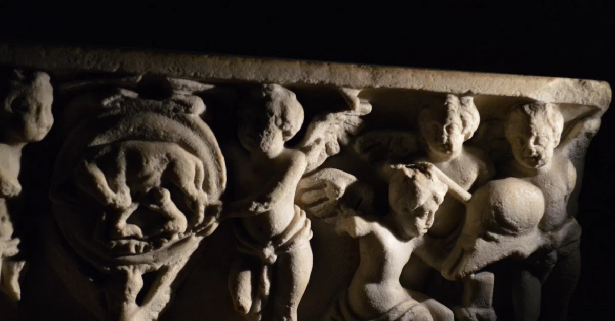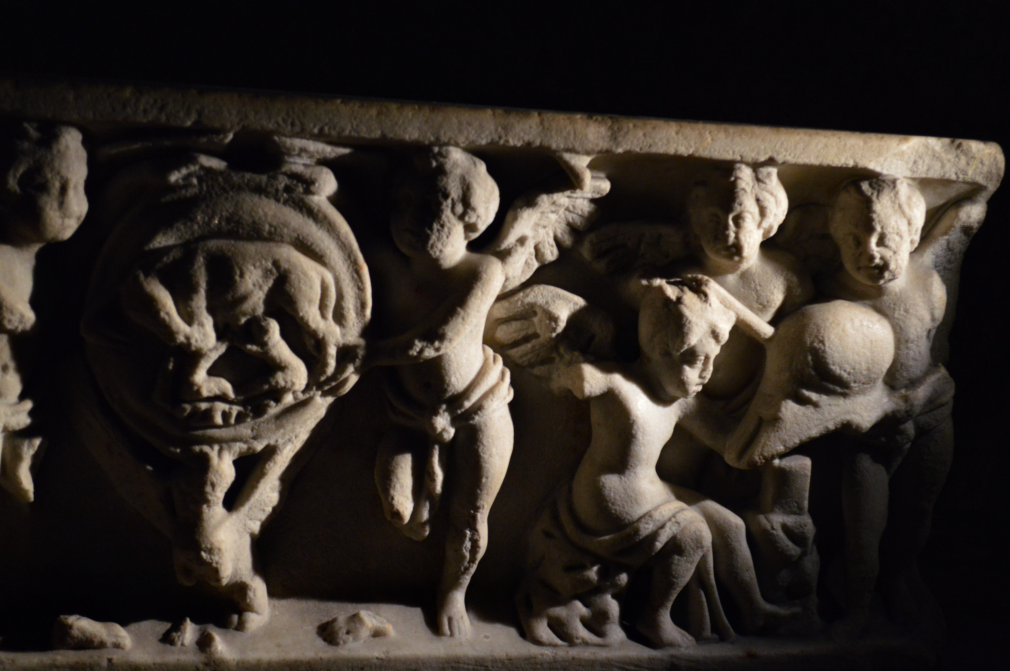 Detail of cherubs from a paleochristian sarcophagus (c. 4th to 6th century CE), showing a crest with the wolf that suckled Romulus and Remus (left) and cherubs forging Mars' helmet (right). In the crypt of the Abbey of St. Victor, Marseille, France.