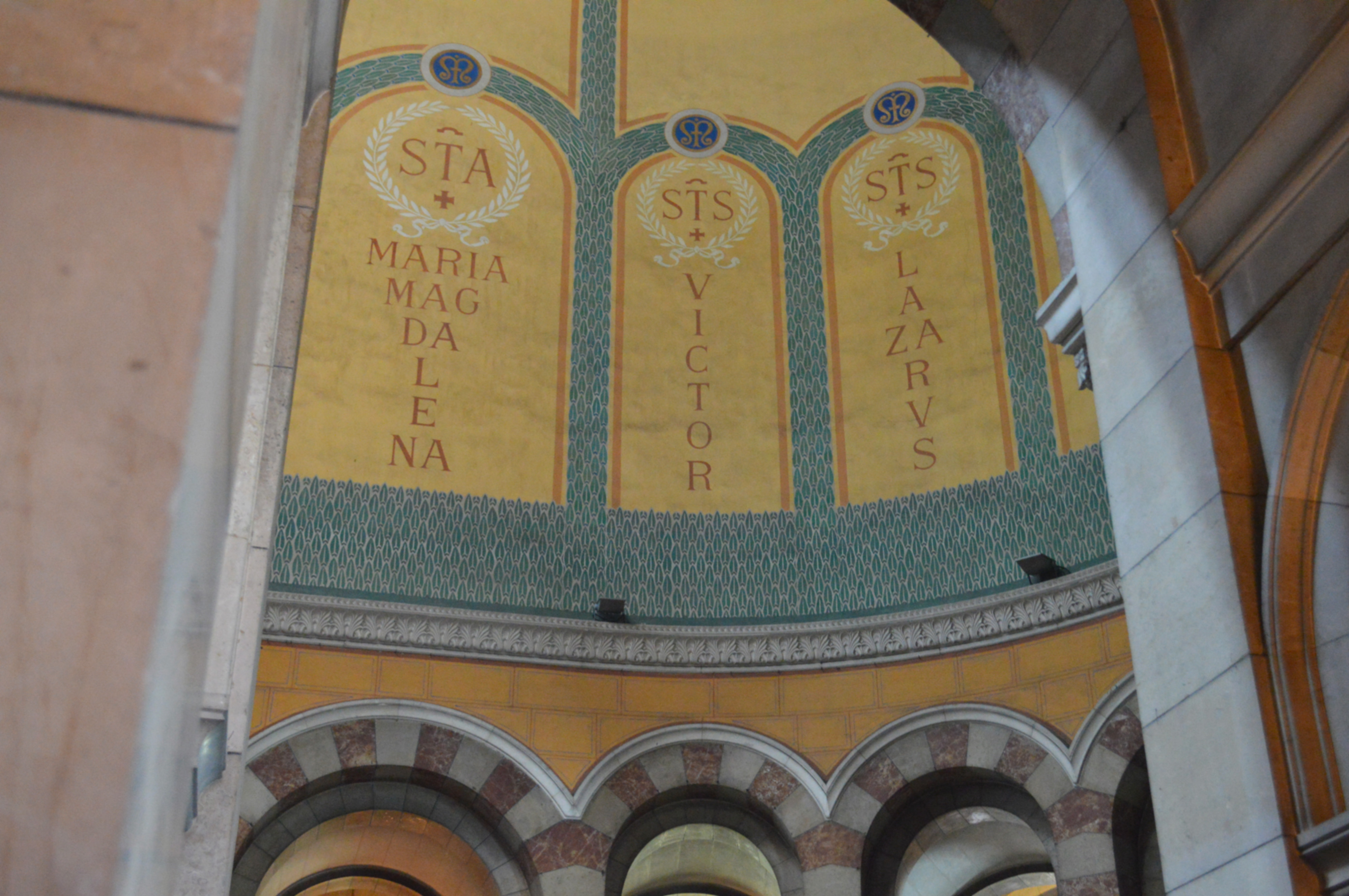 Detail of the secondary dome of the Cathedral of Notre Dame de la Major in Marseille , France (built 1852 - 1893 CE), showing the names of three saints central to the history of Catholicism in the region: Saint Mary Magdalene, Saint Lazarus and Saint Victor.