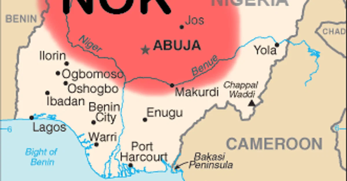 A map indicating the approximate territory inhabited by the people of West Africa's Nok Culture (flourished 500 BCE - 200 CE) in modern-day Nigeria.