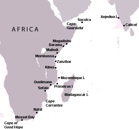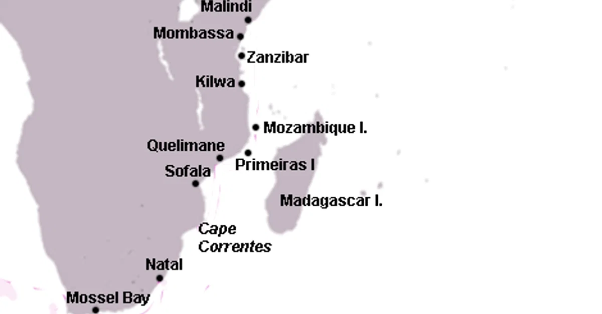A map of the east coast of Africa showing, amongst others, the key trade ports of the Swahili Coast during the medieval period, 12th to 15th century CE.