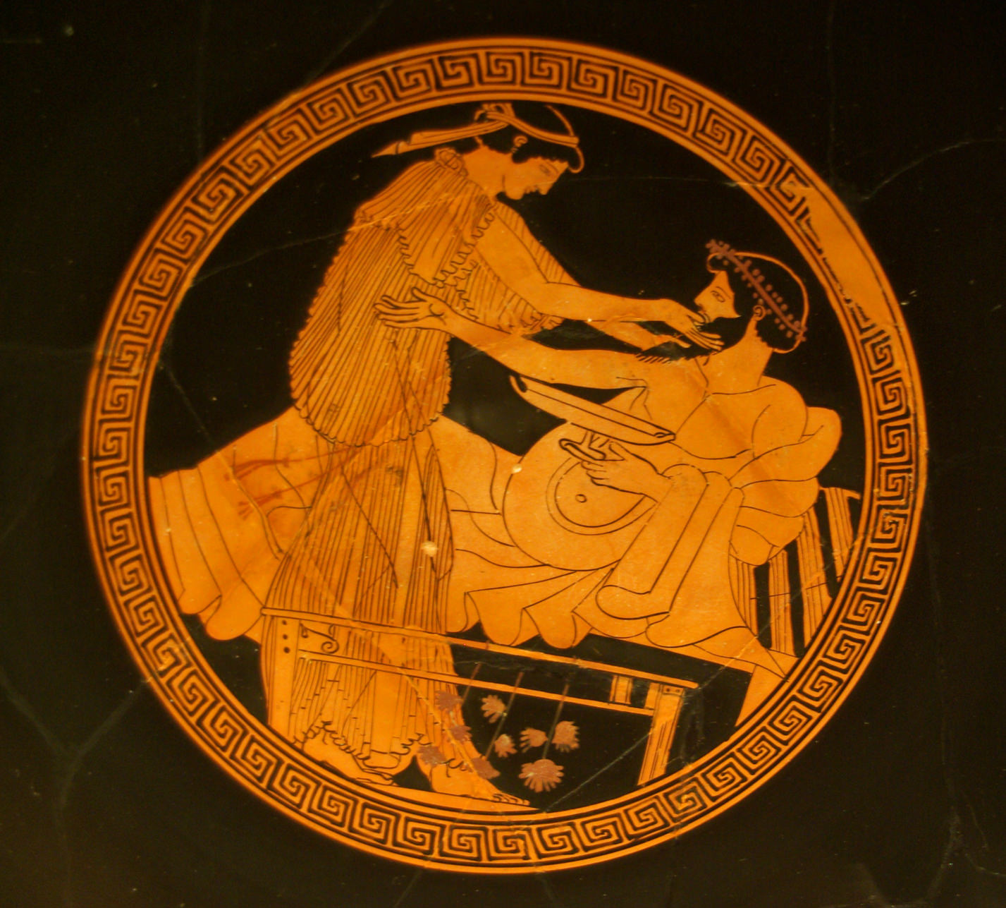 A scene from the interior bowl of a red-figure kylix or stemmed drinking cup (490-480 BCE) depicting a symposiast and hetaira - high-class prostitute. (Museum of Fine Arts, Boston)