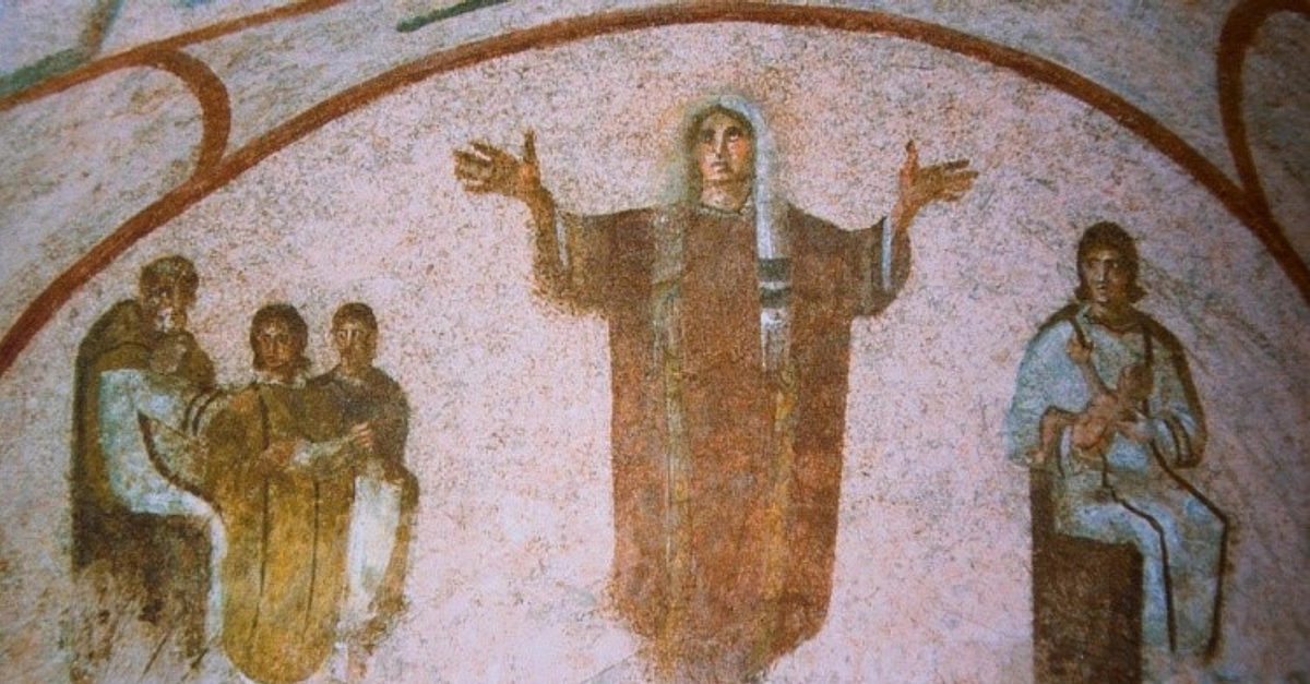 Fresco found in the Catacombs of Priscilla, Rome, Italy and dated to 250 CE. It shows a woman wearing a rich purple garment and a veil, with her hands raised in the position used by priests for public worship