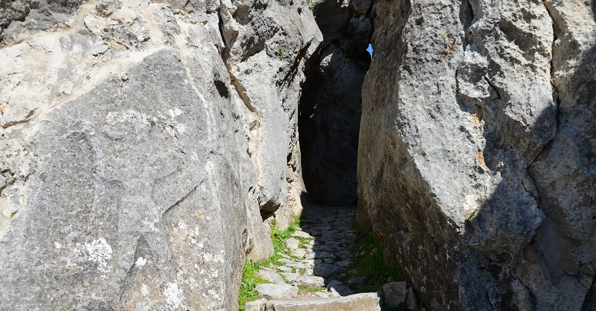 Entrance to Chamber B of the Yazilikaya Hittite Rock Sanctuary near Hattusa (13th century BCE) with a relief of a winged, lion-headed demon.