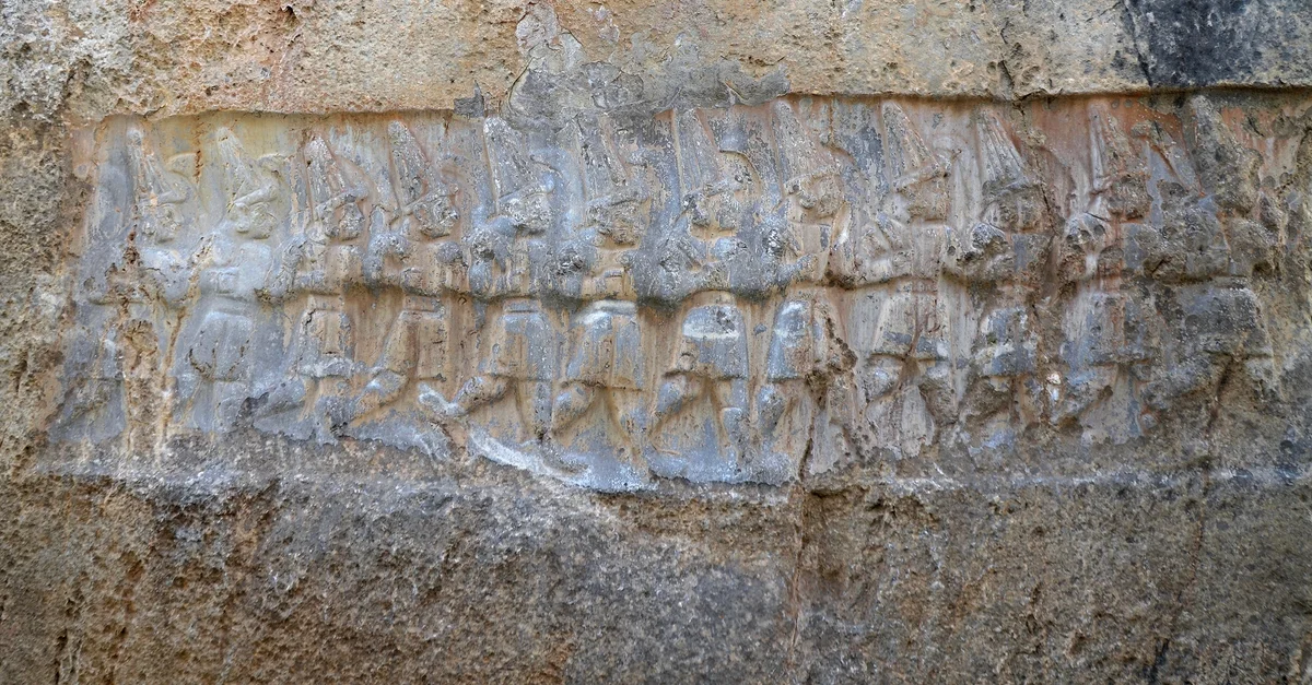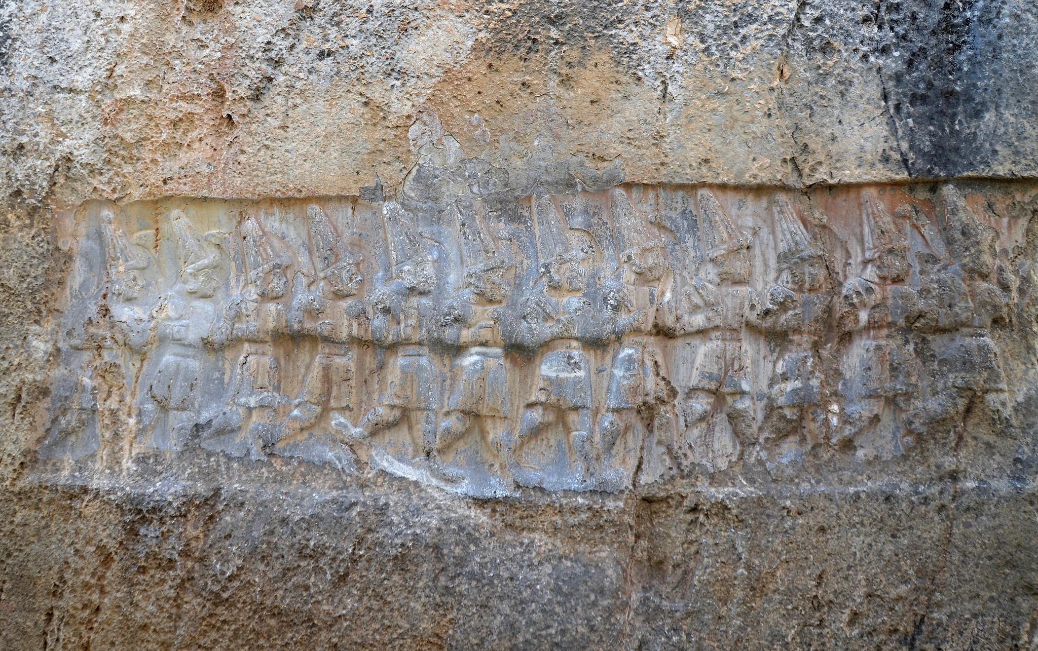 West wall of Chamber B of the Yazilikaya Hittite Sanctuary near Hattusa (13th century BCE) depicting the Twelve Gods of the Underworld. They wear short shirts, belts and shoes curling up at the toe. They each carry a crescent-shaped sword flung over the shoulder, and the horned pointed hats that identify them as divinities.