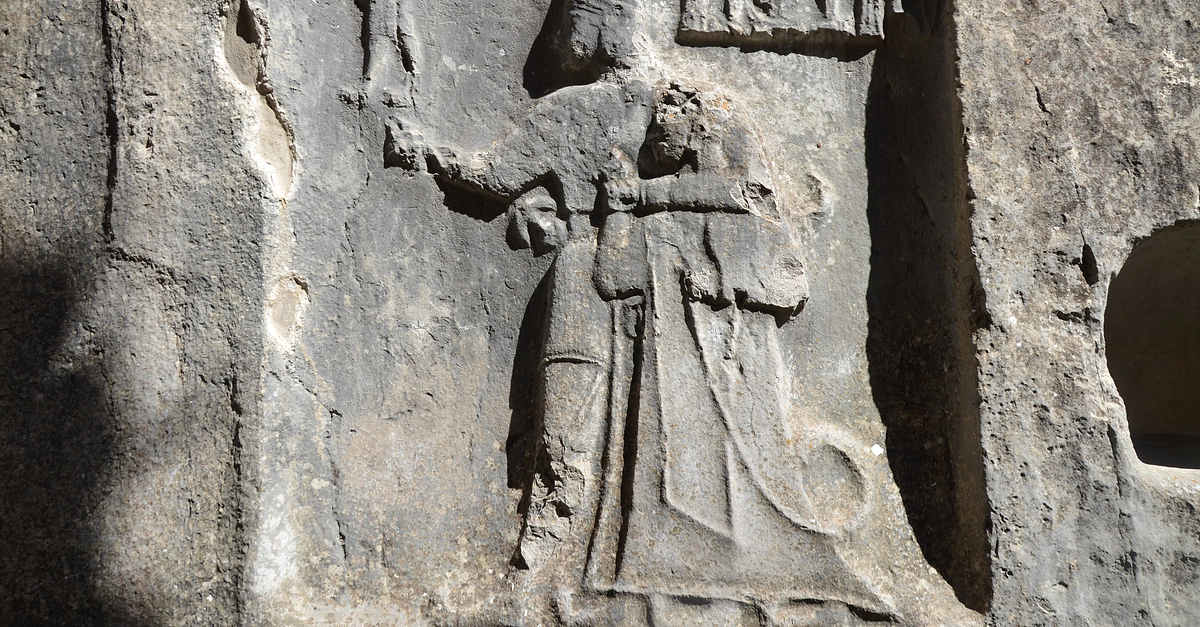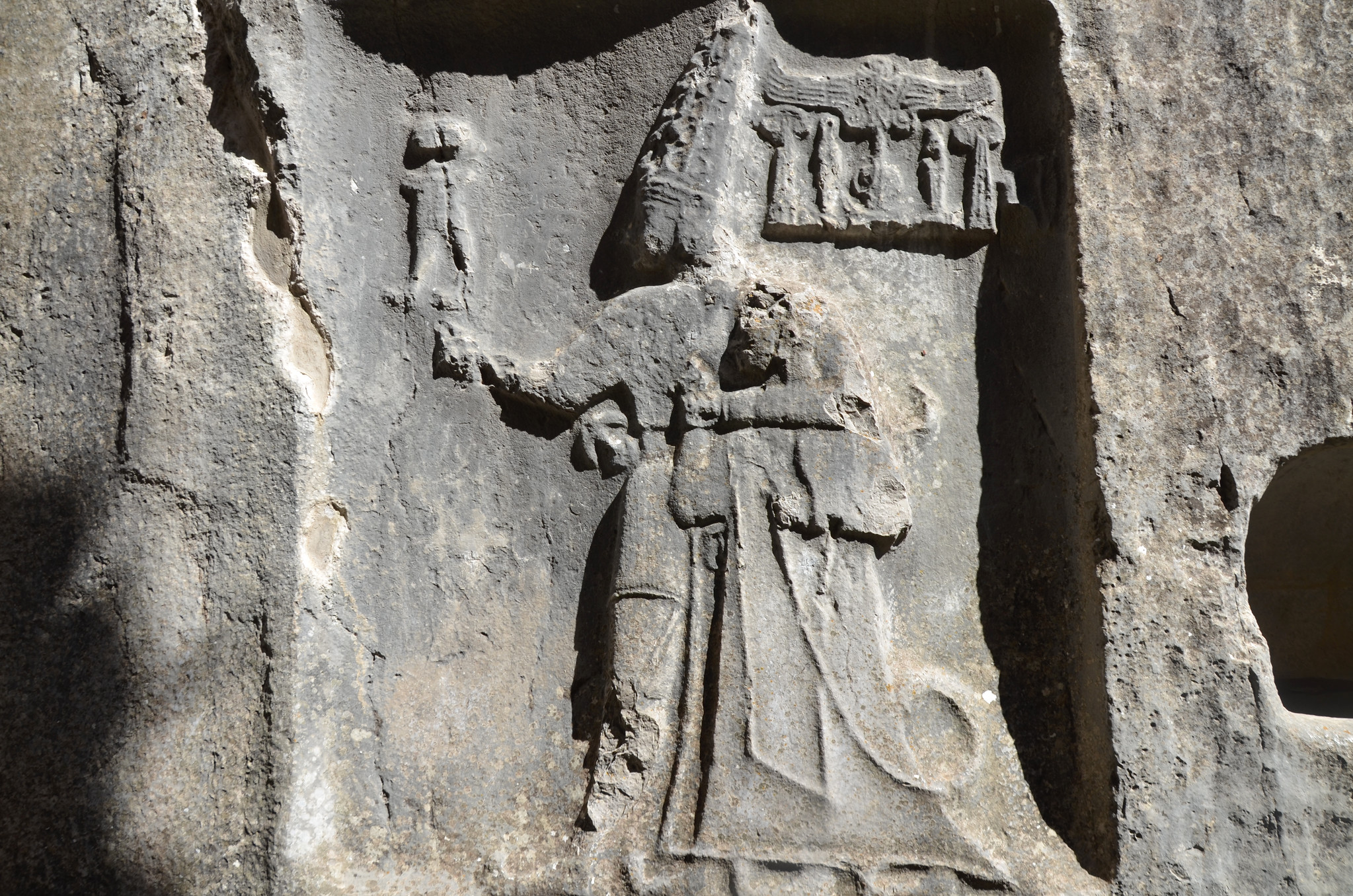 East wall of Chamber B of the Yazilikaya Hittite Rock Sanctuary near Hattusa (13th century BCE) depicting in a niche the God Sharruma (the Hurrian Mountain God and son of the Thunder God Teshub) embracing Great King Tudhaliya IV (r. c. 1237–1209 BCE). The god has his left arm over the king’s shoulders while holding the king’s right wrist. He wears a short tunic and has pointed shoes. The king wears a long coat and carries a sword and a lituus.